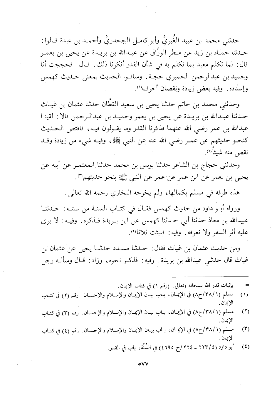 وَحَدَّثَنِي مُحَمَّدُ بْنُ حَاتِمٍ حَدَّثَنَا يَحْيَى بْنُ سَعِيدٍ الْقَطَّانُ حَدَّثَنَا عُثْمَانُ بْنُ غِيَاثٍ حَدَّثَنَا عَبْدُ اللَّهِ بْنُ بُرَيْدَةَ عَنْ يَحْيَى بْنِ يَعْمُرَ وَحُمَيْدِ بْنِ عَبْدِ الرَّحْمَنِ قَالَا: لَقِينَا عَبْدَ اللَّهِ بْنَ عُمَرَ -رَضِيَ اللَّهُ عَنْهُمَا- فَذَكَرْنَا الْقَدَرَ وَمَا يَقُولُونَ فِيهِ, فَاقْتَصَّ الْحَدِيثَ كَنَحْوِ حَدِيثِهِمْ عَنْ عُمَرَ رَضِيَ اللَّهُ عَنْهُ عَنِ النَّبِيِّ صَلَّى اللَّهُ عَلَيْهِ وَسَلَّمَ, وَفِيهِ شَيْءٌ مِنْ زيادة, وقد أنقص مِنْهُ شَيْئًا2.