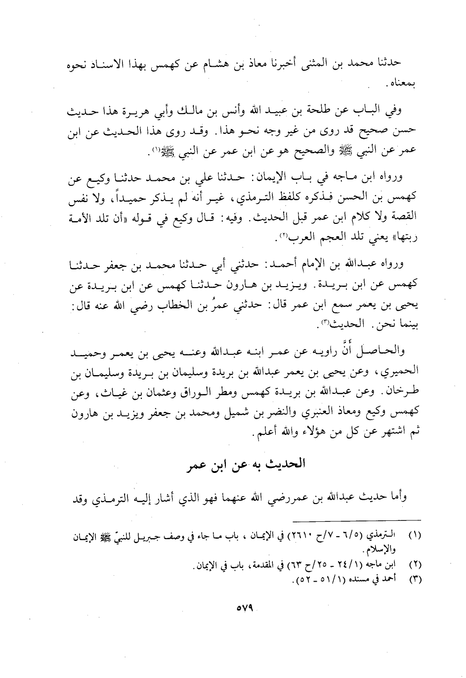 وَرَوَاهُ عَبْدُ اللَّهِ ابن الْإِمَامِ أَحْمَدَ: حَدَّثَنِي أَبِي حَدَّثَنَا مُحَمَّدُ بْنُ جَعْفَرٍ حَدَّثَنَا كَهْمَسٌ عَنِ ابْنِ بُرَيْدَةَ, وَيَزِيدُ بْنُ هَارُونَ حَدَّثَنَا كَهْمَسٌ عَنِ ابْنِ بُرَيْدَةَ عَنْ يَحْيَى بْنِ يَعْمُرَ سَمِعَ ابْنَ عُمَرَ قَالَ: حَدَّثَنِي عُمَرُ بْنُ الْخَطَّابِ رَضِيَ اللَّهُ عَنْهُ قَالَ: بَيْنَمَا نَحْنُ, الْحَدِيثَ3.