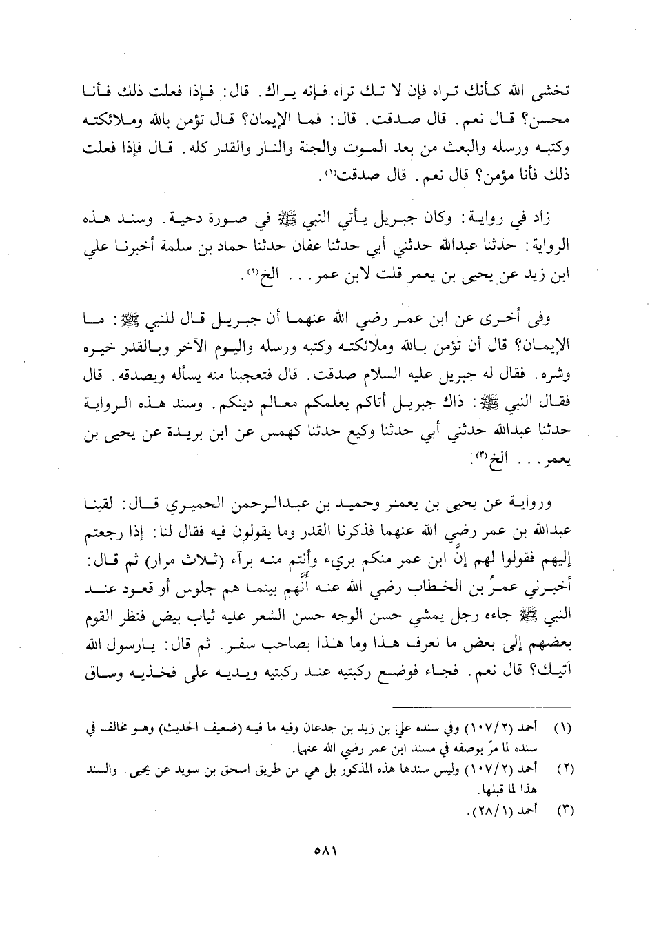 وَفِي أُخْرَى عَنِ ابْنِ عُمَرَ رَضِيَ اللَّهُ عَنْهُمَا أَنَّ جِبْرِيلَ قَالَ لِلنَّبِيِّ صَلَّى اللَّهُ عَلَيْهِ وَسَلَّمَ: "مَا الْإِيمَانُ؟ قَالَ: "أَنْ تُؤْمِنَ بِاللَّهِ وَمَلَائِكَتِهِ وَكُتُبِهِ وَرُسُلِهِ وَالْيَوْمِ الْآخِرِ وَبِالْقَدَرِ خَيْرِهِ وَشَرِّهِ" فَقَالَ لَهُ جِبْرِيلُ عَلَيْهِ السَّلَامُ: صَدَقْتَ قَالَ: فَتَعَجَّبْنَا مِنْهُ يَسْأَلُهُ وَيُصَدِّقُهُ, قَالَ: فقال النبي صَلَّى اللَّهُ عَلَيْهِ وَسَلَّمَ: "ذلك جِبْرِيلُ, أَتَاكُمْ يُعَلِّمُكُمْ مَعَالِمَ دِينِكُمْ" وَسَنَدُ هَذِهِ الرِّوَايَةِ: حَدَّثَنَا عَبْدُ اللَّهِ حَدَّثَنِي أَبِي حَدَّثَنَا وَكِيعٌ حَدَّثَنَا كَهْمَسٌ عَنِ ابْنِ بُرَيْدَةَ عَنْ يَحْيَى بْنِ يَعْمُرَ ... إِلَخْ3.