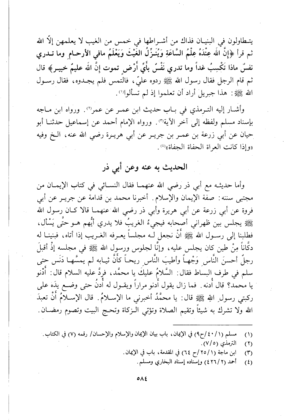 وَأَشَارَ إِلَيْهِ التِّرْمِذِيُّ فِي بَابِ حَدِيثِ ابْنِ عُمَرَ عَنْ عُمَرَ2. وَرَوَاهُ ابْنُ مَاجَهْ بِإِسْنَادِ مُسْلِمٍ وَلَفْظِهِ إِلَى آخَرِ الْآيَةِ3. وَرَوَاهُ الْإِمَامُ أَحْمَدُ عَنْ إِسْمَاعِيلَ: حَدَّثَنَا أَبُو حَيَّانَ عَنْ أَبِي زُرْعَةَ بْنِ عُمَرَ بْنِ جَرِيرٍ عَنْ أَبِي هُرَيْرَةَ رَضِيَ اللَّهُ عَنْهُ ... إِلَخْ وَفِيهِ: "وَإِذَا كَانَتِ الْعُرَاةُ الْحُفَاةُ الْجُفَاةُ"4.