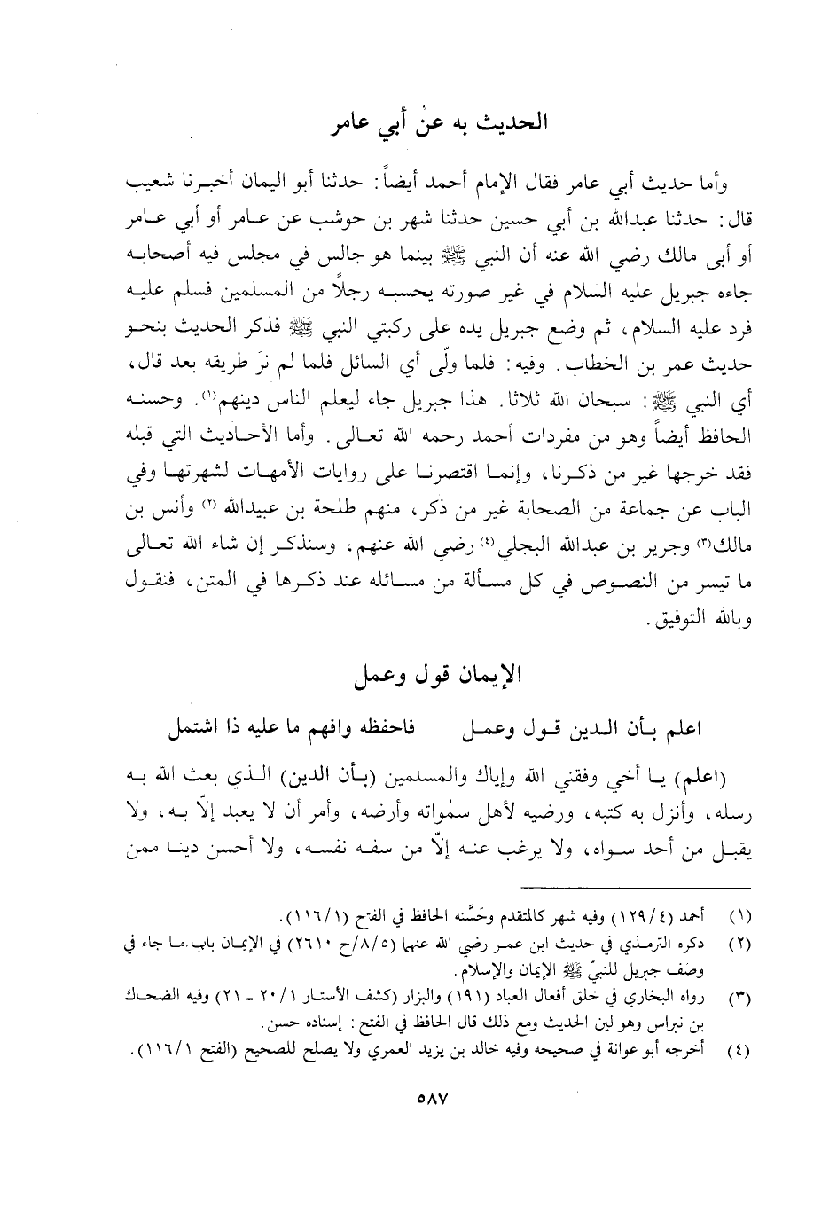 وَأَمَّا حَدِيثُ أَبِي عَامِرٍ فَقَالَ الْإِمَامُ أَحْمَدُ أَيْضًا: حَدَّثَنَا أَبُو الْيَمَانِ أَخْبَرَنَا شُعَيْبٌ قَالَ: حَدَّثَنَا عَبْدُ اللَّهِ بْنُ أَبِي حُسَيْنٍ حَدَّثَنَا شَهْرُ بْنُ حَوْشَبٍ عَنْ عَامِرٍ أَوْ أَبِي عَامِرٍ أَوْ أَبِي مَالِكٍ رَضِيَ اللَّهُ عَنْهُ أَنَّ النَّبِيَّ صَلَّى اللَّهُ عَلَيْهِ وَسَلَّمَ, بَيْنَمَا هُوَ جَالِسٌ فِي مَجْلِسٍ فِيهِ أَصْحَابُهُ جَاءَهُ جِبْرِيلُ عَلَيْهِ السَّلَامُ فِي غَيْرِ صُورَتِهِ, يَحْسَبُهُ رَجُلًا مِنَ الْمُسْلِمِينَ فَسَلَّمَ عَلَيْهِ فَرَدَّ عَلَيْهِ السَّلَامَ, ثُمَّ وَضَعَ جِبْرِيلُ يَدَهُ عَلَى رُكْبَتَيِ النَّبِيِّ صَلَّى اللَّهُ عَلَيْهِ وَسَلَّمَ فَذَكَرَ الْحَدِيثَ بِنَحْوِ حَدِيثِ عُمَرَ بْنِ الْخَطَّابِ. وَفِيهِ: فَلَمَّا وَلَّى أَيِ: السَّائِلُ, فَلَمَّا لَمْ نَرَ طَرِيقَهُ بَعْدُ قَالَ أَيِ النَّبِيُّ صَلَّى اللَّهُ عَلَيْهِ وَسَلَّمَ: "سُبْحَانَ اللَّهِ -ثَلَاثًا- هَذَا جِبْرِيلُ جَاءَ لِيُعَلِّمَ النَّاسَ دِينَهُمْ" 1. وَحَسَّنَهُ الْحَافِظُ أَيْضًا وَهُوَ مِنْ مُفْرَدَاتِ أَحْمَدَ رَحِمَهُ اللَّهُ تَعَالَى. وَأَمَّا الْأَحَادِيثُ الَّتِي قَبْلَهُ فَقَدْ خَرَّجَهَا غَيْرُ مَنْ ذَكَرْنَا وَإِنَّمَا اقْتَصَرْنَا عَلَى رِوَايَاتِ الْأُمَّهَاتِ لِشُهْرَتِهَا وَفِي الْبَابِ عَنْ جَمَاعَةٍ مِنَ الصَّحَابَةِ غَيْرُ مَنْ ذُكِرَ, مِنْهُمْ طَلْحَةُ بْنُ عُبَيْدِ اللَّهِ2 وَأَنَسُ بْنُ مَالِكٍ3 وَجَرِيرُ بْنُ عَبْدِ اللَّهِ الْبَجَلِيُّ4 رَضِيَ اللَّهُ عَنْهُمْ, وَسَنَذْكُرُ إِنْ شَاءَ اللَّهُ تَعَالَى مَا تَيَسَّرَ مِنَ النُّصُوصِ فِي كُلِّ مَسْأَلَةٍ مِنْ مَسَائِلِهِ عِنْدَ ذِكْرِهَا فِي الْمَتْنِ, فَنَقُولُ, وَبِاللَّهِ التَّوْفِيقُ.