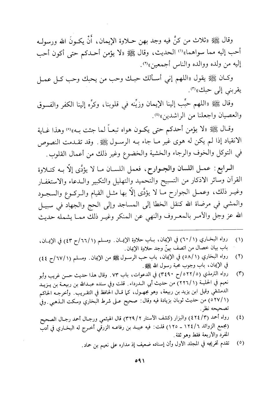 وَقَالَ صَلَّى اللَّهُ عَلَيْهِ وَسَلَّمَ: "ثَلَاثٌ مَنْ كُنَّ فِيهِ وَجَدَ بِهِنَّ حَلَاوَةَ الْإِيمَانِ: أَنْ يَكُونَ اللَّهُ وَرَسُولُهُ أَحَبَّ إِلَيْهِ مِمَّا سِوَاهُمَا ... " 1 الْحَدِيثَ, وَقَالَ صَلَّى اللَّهُ عَلَيْهِ وَسَلَّمَ: "لَا يُؤْمِنُ أَحَدُكُمْ حَتَّى أَكُونَ أَحَبَّ إِلَيْهِ مِنْ وَلَدِهِ وَوَالِدِهِ وَالنَّاسِ أَجْمَعِينَ" 2.