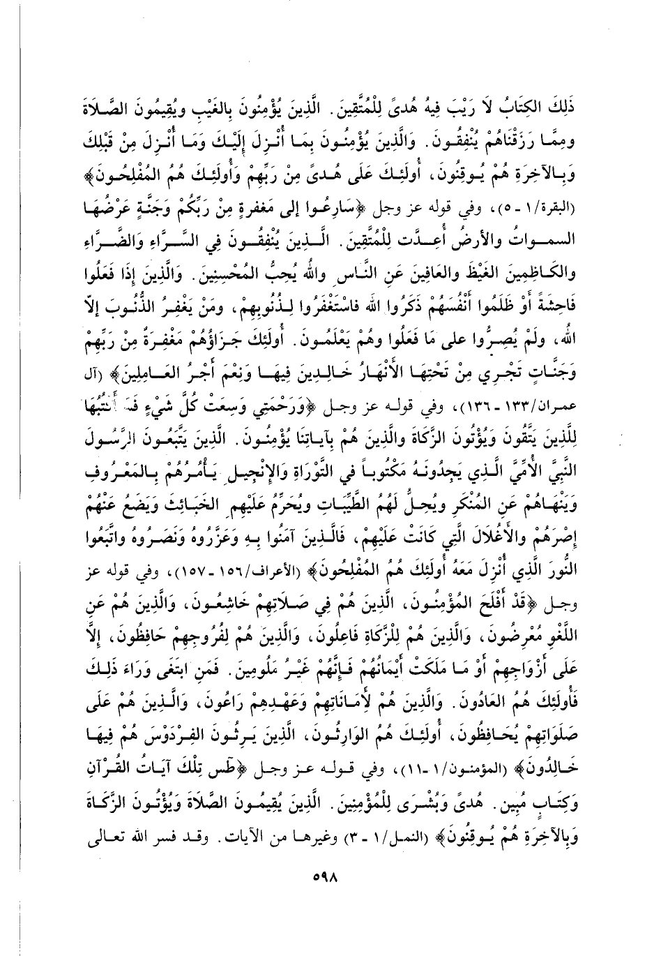 ذَلِكَ الْكِتَابُ لَا رَيْبَ فِيهِ هُدًى لِلْمُتَّقِينَ، الَّذِينَ يُؤْمِنُونَ بِالْغَيْبِ وَيُقِيمُونَ الصَّلَاةَ وَمِمَّا رَزَقْنَاهُمْ يُنْفِقُونَ، وَالَّذِينَ يُؤْمِنُونَ بِمَا أُنْزِلَ إِلَيْكَ وَمَا أُنْزِلَ مِنْ قَبْلِكَ وَبِالْآخِرَةِ هُمْ يُوقِنُونَ، أُولَئِكَ عَلَى هُدًى مِنْ رَبِّهِمْ وَأُولَئِكَ هُمُ الْمُفْلِحُونَ} [الْبَقَرَةِ: 1-5] وَفِي قَوْلِهِ عَزَّ وَجَلَّ: {وَسَارِعُوا إِلَى مَغْفِرَةٍ مِنْ رَبِّكُمْ وَجَنَّةٍ عَرْضُهَا السَّمَاوَاتُ وَالْأَرْضُ أُعِدَّتْ لِلْمُتَّقِينَ، الَّذِينَ يُنْفِقُونَ فِي السَّرَّاءِ وَالضَّرَّاءِ وَالْكَاظِمِينَ الْغَيْظَ وَالْعَافِينَ عَنِ النَّاسِ وَاللَّهُ يُحِبُّ الْمُحْسِنِينَ، وَالَّذِينَ إِذَا فَعَلُوا فَاحِشَةً أَوْ ظَلَمُوا أَنْفُسَهُمْ ذَكَرُوا اللَّهَ فَاسْتَغْفَرُوا لِذُنُوبِهِمْ وَمَنْ يَغْفِرُ الذُّنُوبَ إِلَّا اللَّهُ وَلَمْ يُصِرُّوا عَلَى مَا فَعَلُوا وَهُمْ يَعْلَمُونَ، أُولَئِكَ جَزَاؤُهُمْ مَغْفِرَةٌ مِنْ رَبِّهِمْ وَجَنَّاتٌ تَجْرِي مِنْ تَحْتِهَا الْأَنْهَارُ خَالِدِينَ فِيهَا وَنِعْمَ أَجْرُ الْعَامِلِينَ} [آلِ عِمْرَانَ: 133-136] وَفِي قَوْلِهِ عَزَّ وَجَلَّ: {وَرَحْمَتِي وَسِعَتْ كُلَّ شَيْءٍ فَسَأَكْتُبُهَا لِلَّذِينَ يَتَّقُونَ وَيُؤْتُونَ الزَّكَاةَ وَالَّذِينَ هُمْ بِآيَاتِنَا يُؤْمِنُونَ، الَّذِينَ يَتَّبِعُونَ الرَّسُولَ النَّبِيَّ الْأُمِّيَّ الَّذِي يَجِدُونَهُ مَكْتُوبًا عِنْدَهُمْ فِي التَّوْرَاةِ وَالْإِنْجِيلِ يَأْمُرُهُمْ بِالْمَعْرُوفِ وَيَنْهَاهُمْ عَنِ الْمُنْكَرِ وَيُحِلُّ لَهُمُ الطَّيِّبَاتِ وَيُحَرِّمُ عَلَيْهِمُ الْخَبَائِثَ وَيَضَعُ عَنْهُمْ إِصْرَهُمْ وَالْأَغْلَالَ الَّتِي كَانَتْ عَلَيْهِمْ فَالَّذِينَ آمَنُوا بِهِ وَعَزَّرُوهُ وَنَصَرُوهُ وَاتَّبَعُوا النُّورَ الَّذِي أُنْزِلَ مَعَهُ أُولَئِكَ هُمُ الْمُفْلِحُونَ} [الْأَعْرَافِ: 156، 157] وَفِي قَوْلِهِ عَزَّ وَجَلَّ: {قَدْ أَفْلَحَ الْمُؤْمِنُونَ، الَّذِينَ هُمْ فِي صَلَاتِهِمْ خَاشِعُونَ، وَالَّذِينَ هُمْ عَنِ اللَّغْوِ مُعْرِضُونَ، وَالَّذِينَ هُمْ لِلزَّكَاةِ فَاعِلُونَ، وَالَّذِينَ هُمْ لِفُرُوجِهِمْ حَافِظُونَ، إِلَّا عَلَى أَزْوَاجِهِمْ أوْ مَا مَلَكَتْ أَيْمَانُهُمْ فَإِنَّهُمْ غَيْرُ مَلُومِينَ، فَمَنِ ابْتَغَى وَرَاءَ ذَلِكَ فَأُولَئِكَ هُمُ الْعَادُونَ، وَالَّذِينَ هُمْ لِأَمَانَاتِهِمْ وَعَهْدِهِمْ رَاعُونَ، وَالَّذِينَ هُمْ عَلَى صَلَوَاتِهِمْ يُحَافِظُونَ، أُولَئِكَ هُمُ الْوَارِثُونَ، الَّذِينَ يَرِثُونَ الْفِرْدَوْسَ هُمْ فِيهَا خَالِدُونَ} [الْمُؤْمِنُونَ: 1-11] وَفِي قَوْلِهِ عَزَّ وَجَلَّ: {طس تِلْكَ آيَاتُ الْقُرْآنِ وَكِتَابٍ مُبِينٍ، هُدًى وَبُشْرَى لِلْمُؤْمِنِينَ، الَّذِينَ يُقِيمُونَ الصَّلَاةَ وَيُؤْتُونَ الزَّكَاةَ وَهُمْ بِالْآخِرَةِ هُمْ يُوقِنُونَ} [النَّمْلِ: 1-3] وَغَيْرَهَا مِنَ الْآيَاتِ. وَقَدْ فَسَّرَ اللَّهُ تَعَالَى