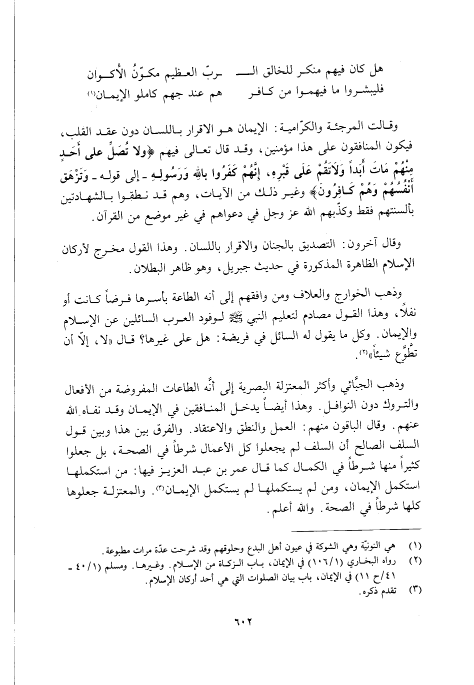 وَذَهَبَ الْجُبَّائِيُّ وَأَكْثَرُ الْمُعْتَزِلَةِ الْبَصْرِيَّةِ إِلَى أَنَّهُ الطَّاعَاتُ الْمَفْرُوضَةُ مِنَ الْأَفْعَالِ وَالتُّرُوكِ دُونَ النَّوَافِلِ, وَهَذَا أَيْضًا يُدْخِلُ الْمُنَافِقِينَ فِي الْإِيمَانِ وَقَدْ نَفَاهُ اللَّهُ عَنْهُمْ. وَقَالَ الْبَاقُونَ مِنْهُمْ: الْعَمَلُ وَالنُّطْقُ وَالِاعْتِقَادُ, وَالْفَرْقُ بَيْنَ هَذَا وَبَيْنَ قَوْلِ السَّلَفِ الصَّالِحِ أَنَّ السَّلَفَ لَمْ يَجْعَلُوا كُلَّ الْأَعْمَالِ شَرْطًا فِي الصِّحَّةِ, بَلْ جَعَلُوا كَثِيرًا مِنْهَا شَرْطًا فِي الْكَمَالِ, كَمَا قَالَ عُمَرُ بْنُ عَبْدِ الْعَزِيزِ فِيهَا: مَنِ اسْتَكْمَلَهَا اسْتَكْمَلَ الْإِيمَانَ وَمَنْ لَمْ يَسْتَكْمِلْهَا لَمْ يَسْتَكْمِلِ الْإِيمَانَ3, وَالْمُعْتَزِلَةُ جَعَلُوهَا كُلَّهَا شَرْطًا فِي الصِّحَّةِ, وَاللَّهُ أَعْلَمُ.