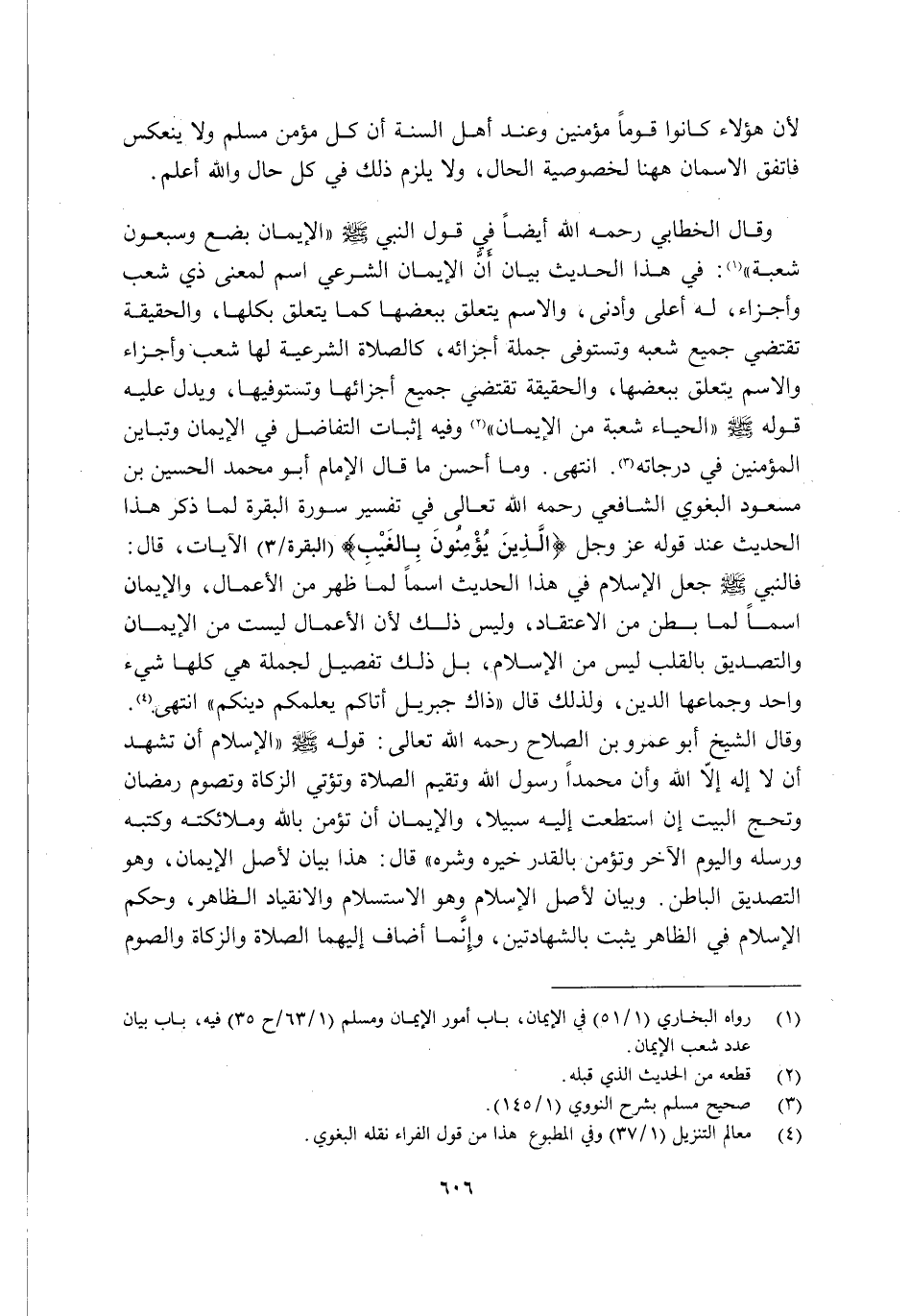 وَقَالَ الْخَطَّابِيُّ رَحِمَهُ اللَّهُ أَيْضًا فِي قَوْلِ النَّبِيِّ صَلَّى اللَّهُ عَلَيْهِ وَسَلَّمَ: "الْإِيمَانُ بِضْعٌ وَسَبْعُونَ شُعْبَةً ... " 1: فِي هَذَا الْحَدِيثِ بَيَانُ أَنَّ الْإِيمَانَ الشَّرْعِيَّ اسْمٌ لِمَعْنًى ذِي شُعَبٍ وَأَجْزَاءٍ, لَهُ أَعْلَى وَأَدْنَى, والاسم يتعلق ببعضها كَمَا يَتَعَلَّقُ بِكُلِّهَا, وَالْحَقِيقَةُ تَقْتَضِي جَمِيعَ شُعَبِهِ وَتَسْتَوْفِي جُمْلَةَ أَجْزَائِهِ؛ كَالصَّلَاةِ الشَّرْعِيَّةِ لَهَا شُعَبٌ وَأَجْزَاءٌ والاسم يتعلق ببعضها, وَالْحَقِيقَةُ تقتضي جميع أجزائها وَتَسْتَوْفِيهَا, وَيَدُلُّ عَلَيْهِ قَوْلُهُ صَلَّى اللَّهُ عَلَيْهِ وَسَلَّمَ: "الْحَيَاءُ شُعْبَةٌ مِنَ الْإِيمَانِ" 2 وفيه إثبات التفاضل فِي الْإِيمَانِ وَتَبَايُنِ الْمُؤْمِنِينَ في درجاته3. ا. هـ. وَمَا أَحْسَنَ مَا قَالَ الْإِمَامُ أَبُو مُحَمَّدٍ الْحُسَيْنُ بْنُ مَسْعُودٍ الْبَغَوِيُّ الشَّافِعِيُّ رَحِمَهُ اللَّهُ تَعَالَى فِي تَفْسِيرِ سُورَةِ الْبَقَرَةِ, لَمَّا ذَكَرَ هَذَا الْحَدِيثَ عِنْدَ قَوْلِهِ عَزَّ وَجَلَّ {الَّذِينَ يُؤْمِنُونَ بِالْغَيْبِ} [الْبَقَرَةِ: 3] الْآيَاتِ, قَالَ: فَالنَّبِيُّ صَلَّى اللَّهُ عَلَيْهِ وَسَلَّمَ جَعَلَ الْإِسْلَامَ فِي هَذَا الْحَدِيثِ اسْمًا لِمَا ظَهَرَ مِنَ الْأَعْمَالِ, وَالْإِيمَانَ اسْمًا لِمَا بَطَنَ مِنْ الِاعْتِقَادِ, وَلَيْسَ ذَلِكَ لِأَنَّ الْأَعْمَالَ لَيْسَتْ مِنَ الْإِيمَانِ وَالتَّصْدِيقَ بِالْقَلْبِ لَيْسَ مِنَ الْإِسْلَامِ, بَلْ ذَلِكَ تَفْصِيلٌ لِجُمْلَةٍ هِيَ كُلُّهَا شَيْءٌ وَاحِدٌ وَجُمَّاعُهَا الدِّينُ, وَلِذَلِكَ قَالَ: "ذَاكَ جِبْرِيلُ, أَتَاكُمْ يعلمكم دينكم" ا. هـ4. وَقَالَ الشَّيْخُ أَبُو عَمْرِو بْنُ الصَّلَاحِ رَحِمَهُ اللَّهُ تَعَالَى: قَوْلُهُ صَلَّى اللَّهُ عَلَيْهِ وَسَلَّمَ: "الْإِسْلَامُ أَنَّ تَشْهَدَ أَنْ لَا إِلَهَ إِلَّا اللَّهُ وَأَنَّ مُحَمَّدًا رَسُولُ اللَّهِ وَتُقِيمَ الصَّلَاةَ وَتُؤْتِيَ الزَّكَاةَ وَتَصُومَ رَمَضَانَ وَتَحُجَّ الْبَيْتَ إِنِ اسْتَطَعْتَ إِلَيْهِ سَبِيلًا, وَالْإِيمَانُ أَنْ تُؤْمِنَ بِاللَّهِ وَمَلَائِكَتِهِ وَكُتُبِهِ وَرُسُلِهِ وَالْيَوْمِ الْآخِرِ وَتُؤْمِنَ بِالْقَدَرِ خَيْرِهِ وَشَرِّهِ" قَالَ: هَذَا بَيَانٌ لِأَصْلِ الْإِيمَانِ, وَهُوَ التَّصْدِيقُ الْبَاطِنُ وَبَيَانٌ لِأَصْلِ الْإِسْلَامِ, وَهُوَ الِاسْتِسْلَامُ وَالِانْقِيَادُ الظَّاهِرُ, وَحُكْمُ الْإِسْلَامِ فِي الظَّاهِرِ يَثْبُتُ بِالشَّهَادَتَيْنِ, وَإِنَّمَا أَضَافَ إِلَيْهِمَا الصَّلَاةَ وَالزَّكَاةَ وَالصَّوْمَ