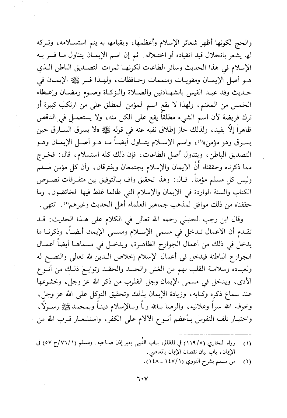وَالْحَجَّ لِكَوْنِهَا أَظْهَرَ شَعَائِرِ الْإِسْلَامِ وَأَعْظَمَهَا, وَبِقِيَامِهَا بِهِ يَتِمُّ اسْتِسْلَامُهُ, وَتَرْكُهُ لَهَا يُشْعِرُ بِانْحِلَالِ قَيْدِ انْقِيَادِهِ أَوِ اخْتِلَالِهِ. ثُمَّ إِنَّ اسْمَ الْإِيمَانِ يَتَنَاوَلُ مَا فُسِّرَ بِهِ الْإِسْلَامُ فِي هَذَا الْحَدِيثِ وَسَائِرُ الطَّاعَاتِ لِكَوْنِهَا ثَمَرَاتِ التَّصْدِيقِ الْبَاطِنِ الَّذِي هُوَ أَصْلُ الْإِيمَانِ وَمُقَوِّيَاتٍ وَمُتَمِّمَاتٍ وَحَافِظَاتٍ؛ وَلِهَذَا فَسَّرَ صَلَّى اللَّهُ عَلَيْهِ وَسَلَّمَ الْإِيمَانَ فِي حَدِيثِ وَفْدِ عَبْدِ الْقَيْسِ بِالشَّهَادَتَيْنِ وَالصَّلَاةِ وَالزَّكَاةِ وَصَوْمِ رَمَضَانَ وَإِعْطَاءِ الْخُمْسِ مِنَ الْمَغْنَمِ؛ وَلِهَذَا لَا يَقَعُ اسْمُ الْمُؤْمِنِ الْمُطْلَقُ عَلَى مَنِ ارْتَكَبَ كَبِيرَةً أَوْ تَرَكَ فَرِيضَةً لِأَنَّ اسْمَ الشَّيْءِ مُطْلَقًا يَقَعُ عَلَى الكل منه, ولا يستعمل فِي النَّاقِصِ ظَاهِرًا إِلَّا بِقَيْدٍ؛ وَلِذَلِكَ جَازَ إِطْلَاقُ نَفْيِهِ عَنْهُ فِي قَوْلِهِ صَلَّى اللَّهُ عَلَيْهِ وَسَلَّمَ: "لَا يَسْرِقُ السَّارِقُ حِينَ يَسْرِقُ وَهُوَ مُؤْمِنٌ" 1، وَاسْمُ الْإِسْلَامِ يَتَنَاوَلُ أَيْضًا مَا هُوَ أَصْلُ الْإِيمَانِ وَهُوَ التَّصْدِيقُ الْبَاطِنُ, وَيَتَنَاوَلُ أَصْلَ الطَّاعَاتِ فَإِنَّ ذَلِكَ كُلَّهُ اسْتِسْلَامٌ, قَالَ: فَخَرَجَ مِمَّا ذَكَرْنَاهُ وَحَقَّقْنَاهُ أَنَّ الْإِيمَانَ وَالْإِسْلَامَ يَجْتَمِعَانِ وَيَفْتَرِقَانِ, وَأَنَّ كُلَّ مُؤْمِنٍ مُسْلِمٌ وَلَيْسَ كُلُّ مُسْلِمٍ مُؤْمِنًا. قَالَ: وَهَذَا تَحْقِيقٌ وَافٍ بِالتَّوْفِيقِ بَيْنَ مُتَفَرِّقَاتِ نُصُوصِ الْكِتَابِ وَالسُّنَّةِ الْوَارِدَةِ فِي الْإِيمَانِ وَالْإِسْلَامِ الَّتِي طَالَمَا غَلِطَ فِيهَا الْخَائِضُونَ, وَمَا حَقَّقْنَاهُ مِنْ ذَلِكَ مُوَافِقٌ لِمَذْهَبِ جَمَاهِيرِ الْعُلَمَاءِ أَهْلِ الحديث وغيرهم2. ا. هـ.