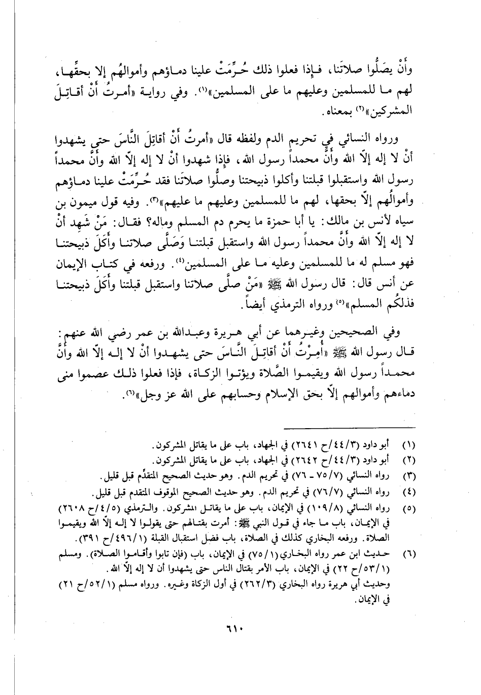 وَفِي الصَّحِيحَيْنِ وَغَيْرِهِمَا عَنْ أَبِي هُرَيْرَةَ وَعَبْدِ اللَّهِ بْنِ عُمَرَ رَضِيَ اللَّهُ عَنْهُمْ: قَالَ رَسُولُ اللَّهِ صَلَّى اللَّهُ عَلَيْهِ وَسَلَّمَ: "أُمِرْتُ أَنْ أُقَاتِلَ النَّاسَ حَتَّى يَشْهَدُوا أَنْ لَا إِلَهَ إِلَّا اللَّهُ وَأَنَّ مُحَمَّدًا رَسُولُ اللَّهِ وَيُقِيمُوا الصَّلَاةَ وَيُؤْتُوا الزَّكَاةَ, فَإِذَا فَعَلُوا ذَلِكَ عَصَمُوا مِنِّي دِمَاءَهُمْ وَأَمْوَالَهُمْ إِلَّا بِحَقِّ الْإِسْلَامِ, وَحِسَابُهُمْ عَلَى اللَّهِ عَزَّ وَجَلَّ" 6.