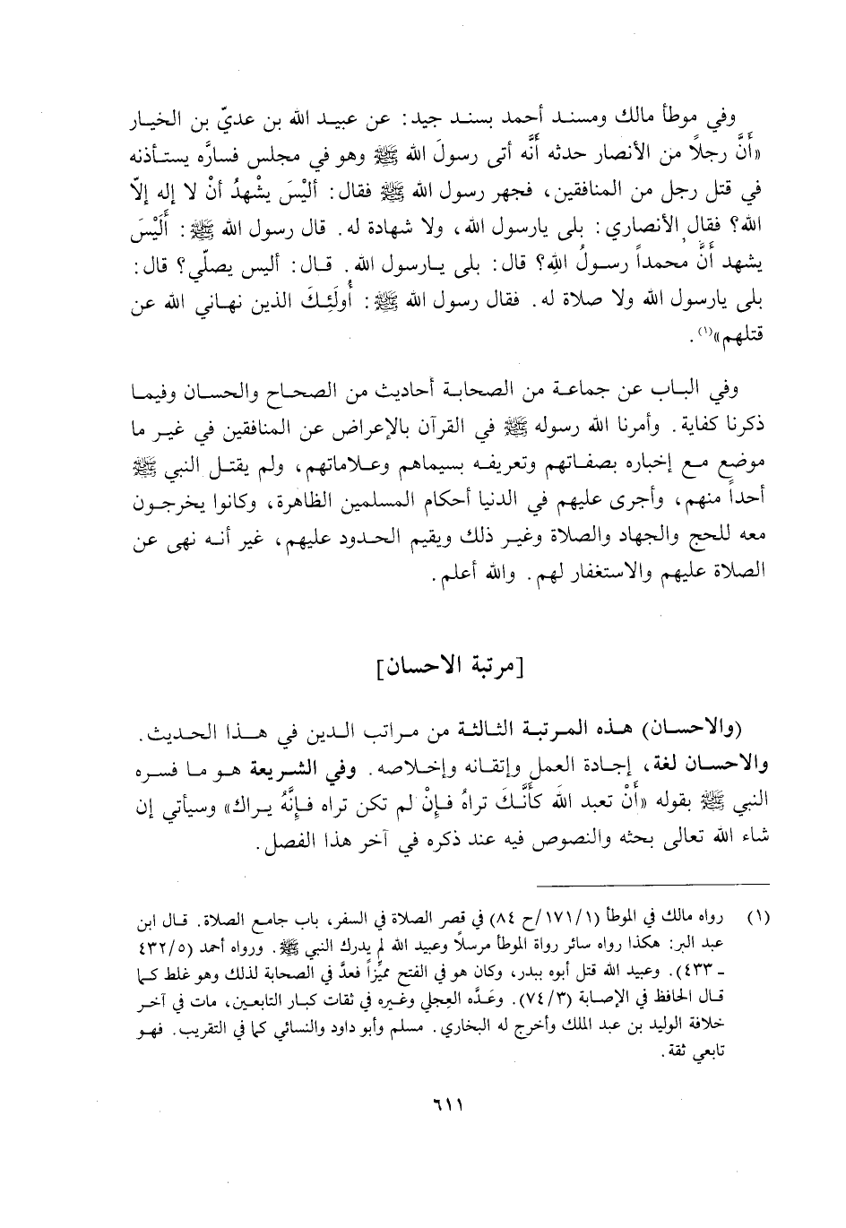 وَفِي مُوَطَّأِ مَالِكٍ وَمُسْنَدِ أَحْمَدَ بِسَنَدٍ جَيِّدٍ: عَنْ عُبَيْدِ اللَّهِ بْنِ عَدِيِّ بْنِ الْخِيَارِ أَنَّ رَجُلًا مِنَ الْأَنْصَارِ حَدَّثَهُ أَنَّهُ أَتَى رَسُولَ اللَّهِ -صَلَّى اللَّهُ عَلَيْهِ وَسَلَّمَ- وَهُوَ فِي مَجْلِسٍ فَسَارَّهُ يَسْتَأْذِنُهُ فِي قَتْلِ رَجُلٍ مِنَ الْمُنَافِقِينَ, فَجَهَرَ رَسُولُ اللَّهِ صَلَّى اللَّهُ عَلَيْهِ وَسَلَّمَ فَقَالَ: "أَلَيْسَ يَشْهَدُ أَنْ لَا إِلَهَ إِلَّا اللَّهُ "؟ فَقَالَ الْأَنْصَارِيُّ: بَلَى يَا رَسُولَ اللَّهِ وَلَا شَهَادَةَ لَهُ, قَالَ رَسُولُ اللَّهِ صَلَّى اللَّهُ عَلَيْهِ وَسَلَّمَ: "أَلَيْسَ يَشْهَدُ أَنَّ مُحَمَّدًا رَسُولُ اللَّهِ "؟ قَالَ: بَلَى يَا رَسُولَ اللَّهِ قَالَ: "أَلَيْسَ يُصَلِّي"؟ قَالَ: بَلَى يَا رَسُولَ اللَّهِ وَلَا صَلَاةَ لَهُ. فَقَالَ رَسُولُ اللَّهِ صَلَّى اللَّهُ عَلَيْهِ وَسَلَّمَ: "أُولَئِكَ الَّذِينَ نَهَانِي اللَّهُ عَنْ قَتْلِهِمْ" 1.