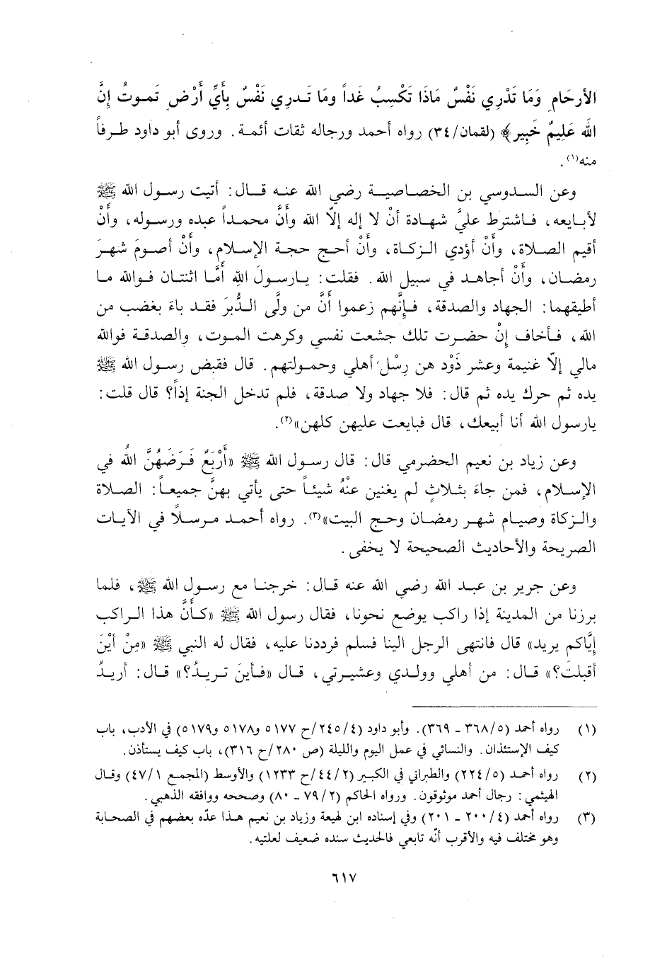 وَعَنْ زِيَادِ بْنِ نُعَيْمٍ الْحَضْرَمِيِّ قَالَ: قَالَ رَسُولُ اللَّهِ صَلَّى اللَّهُ عَلَيْهِ وَسَلَّمَ: "أَرْبَعٌ فَرَضَهُنَّ اللَّهُ فِي الْإِسْلَامِ, فَمَنْ جَاءَ بِثَلَاثٍ لَمْ يُغْنِينَ عَنْهُ شَيْئًا حَتَّى يَأْتِيَ بِهِنَّ جَمِيعًا: الصَّلَاةُ وَالزَّكَاةُ وَصِيَامُ شَهْرِ رَمَضَانَ وَحَجُّ الْبَيْتِ"3 رَوَاهُ أَحْمَدُ مُرْسَلًا وفي الْآيَاتِ الصَّرِيحَةِ وَالْأَحَادِيثِ الصَّحِيحَةِ لَا يَخْفَى.