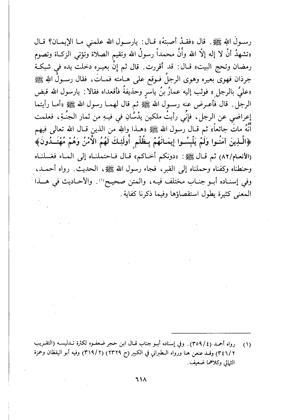 رَسُولَ اللَّهِ صَلَّى اللَّهُ عَلَيْهِ وَسَلَّمَ, قَالَ: "فَقَدْ أَصَبْتَهُ" قَالَ: يَا رَسُولَ اللَّهِ عَلِّمْنِي مَا الْإِيمَانُ؟ قَالَ: "تَشْهَدُ أَنْ لَا إِلَهَ إِلَّا اللَّهُ وَأَنَّ مُحَمَّدًا رَسُولُ اللَّهِ وَتُقِيمُ الصَّلَاةَ وَتُؤْتِي الزَّكَاةَ وَتَصُومُ رَمَضَانَ وَتَحُجُّ الْبَيْتَ" قَالَ: قَدْ أَقْرَرْتُ قَالَ: ثُمَّ إِنَّ بَعِيرَهُ دَخَلَتْ يَدُهُ فِي شَبَكَةِ جُرْذَانٍ فَهَوَى بَعِيرُهُ وَهَوَى الرَّجُلِ فَوَقَعَ عَلَى هَامَتِهِ فَمَاتَ, فَقَالَ رَسُولُ اللَّهِ صَلَّى اللَّهُ عَلَيْهِ وَسَلَّمَ: "عَلَيَّ بِالرَّجُلِ" فَوَثَبَ إِلَيْهِ عَمَّارُ بْنُ يَاسِرٍ وَحُذَيْفَةُ فَأَقْعَدَاهُ فَقَالَا: يَا رَسُولَ اللَّهِ قُبِضَ الرَّجُلُ قَالَ: فَأَعْرَضَ عَنْهُ رَسُولُ اللَّهِ صَلَّى اللَّهُ عَلَيْهِ وَسَلَّمَ ثُمَّ قَالَ لَهُمَا رَسُولُ اللَّهِ صَلَّى اللَّهُ عَلَيْهِ وَسَلَّمَ: "أَمَّا رَأَيْتُمَا إِعْرَاضِي عَنِ الرَّجُلِ, فَإِنِّي رَأَيْتُ مَلَكَيْنِ يَدُسَّانِ فِي فِيهِ مِنْ ثِمَارِ الْجَنَّةِ, فَعَلِمْتُ أَنَّهُ مَاتَ جَائِعًا" ثُمَّ قَالَ رَسُولُ اللَّهِ صَلَّى اللَّهُ عَلَيْهِ وَسَلَّمَ: "هَذَا وَاللَّهِ مِنَ الَّذِينَ قَالَ اللَّهُ تَعَالَى فِيهِمْ: {الَّذِينَ آمَنُوا وَلَمْ يَلْبِسُوا إِيمَانَهُمْ بِظُلْمٍ أُولَئِكَ لَهُمُ الْأَمْنُ وَهُمْ مُهْتَدُونَ} [الْأَنْعَامِ: 82] " ثُمَّ قَالَ صَلَّى اللَّهُ عَلَيْهِ وَسَلَّمَ: "دُونَكُمْ أَخَاكُمْ" قَالَ: فَاحْتَمَلْنَاهُ إِلَى الْمَاءِ فَغَسَّلْنَاهُ وَحَنَّطْنَاهُ وَكَفَّنَّاهُ وَحَمَلْنَاهُ إِلَى الْقَبْرِ, فَجَاءَ رَسُولُ اللَّهِ صَلَّى اللَّهُ عَلَيْهِ وَسَلَّمَ, الْحَدِيثَ رَوَاهُ أَحْمَدُ وَفِي إِسْنَادِهِ أَبُو جَنَابٍ, مُخْتَلَفٌ فِيهِ, وَالْمَتْنُ صَحِيحٌ1. وَالْأَحَادِيثُ فِي هَذَا الْمَعْنَى كَثِيرَةٌ يَطُولُ اسْتِقْصَاؤُهَا, وَفِيمَا ذَكَرْنَا كِفَايَةٌ.