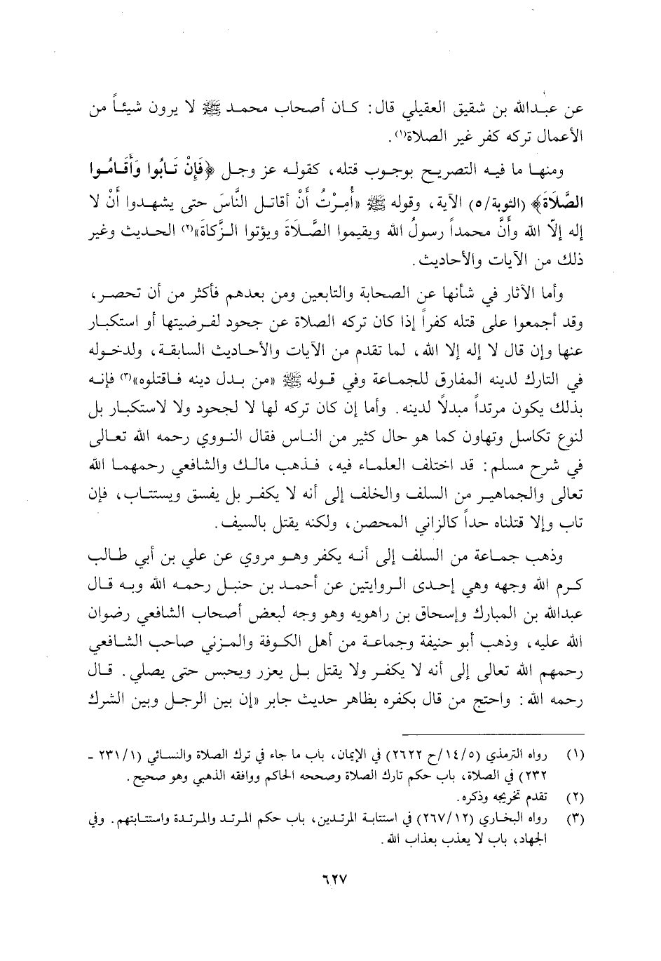 عَنْ عَبْدِ اللَّهِ بْنِ شَقِيقٍ الْعُقَيْلِيِّ قَالَ: كَانَ أَصْحَابُ مُحَمَّدٍ صَلَّى اللَّهُ عَلَيْهِ وَسَلَّمَ لَا يَرَوْنَ شَيْئًا مِنَ الْأَعْمَالِ تَرْكُهُ كُفْرٌ غَيْرَ الصَّلَاةِ1.