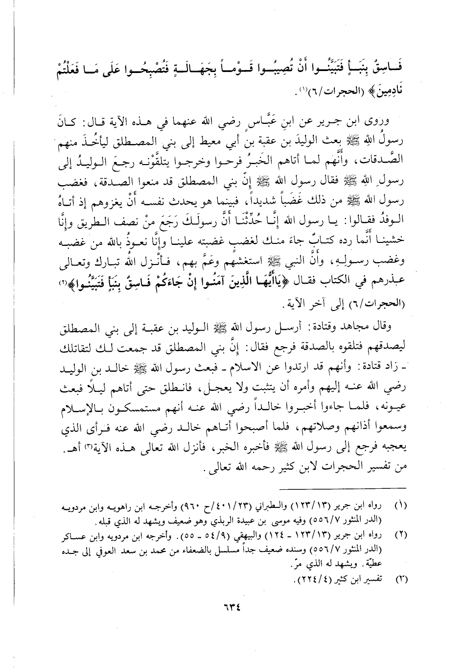 وَقَالَ مُجَاهِدٌ وَقَتَادَةُ: أَرْسَلَ رَسُولُ اللَّهِ صَلَّى اللَّهُ عَلَيْهِ وَسَلَّمَ الْوَلِيدَ بْنَ عُقْبَةَ إِلَى بَنِي الْمُصْطَلِقِ لِيُصْدِقَهُمْ, فَتَلَقَّوْهُ بِالصَّدَقَةِ فَرَجَعَ فَقَالَ: إِنَّ بَنِي الْمُصْطَلِقِ قَدْ جَمَعَتْ لَكَ لِتُقَاتِلَكَ -زَادَ قَتَادَةُ: وَأَنَّهُمْ قَدِ ارْتَدُّوا عَنِ الْإِسْلَامِ- فَبَعَثَ رَسُولُ اللَّهِ صَلَّى اللَّهُ عَلَيْهِ وَسَلَّمَ خَالِدَ بْنَ الْوَلِيدِ رَضِيَ اللَّهُ عَنْهُ إِلَيْهِمْ, وَأَمَرَهُ أَنْ يَتَثَبَّتَ وَلَا يَعْجَلَ, فَانْطَلَقَ حَتَّى أَتَاهُمْ لَيْلًا فَبَعَثَ عُيُونَهُ فَلَمَّا جَاءُوا أَخْبَرُوا خَالِدًا رَضِيَ اللَّهُ عَنْهُ أَنَّهُمْ مُسْتَمْسِكُونَ بِالْإِسْلَامِ وَسَمِعُوا أَذَانَهُمْ وَصَلَاتَهُمْ, فَلَمَّا أَصْبَحُوا أَتَاهُمْ خَالِدٌ رَضِيَ اللَّهُ عَنْهُ فَرَأَى الَّذِي يُعْجِبُهُ, فَرَجَعَ إِلَى رَسُولِ اللَّهِ صَلَّى اللَّهُ عَلَيْهِ وَسَلَّمَ فَأَخْبَرَهُ الْخَبَرَ, فَأَنْزَلَ اللَّهُ تَعَالَى هذه الآية3 ا. هـ. مِنْ تَفْسِيرِ الْحُجُرَاتِ لِابْنِ كَثِيرٍ رَحِمَهُ اللَّهُ تَعَالَى.