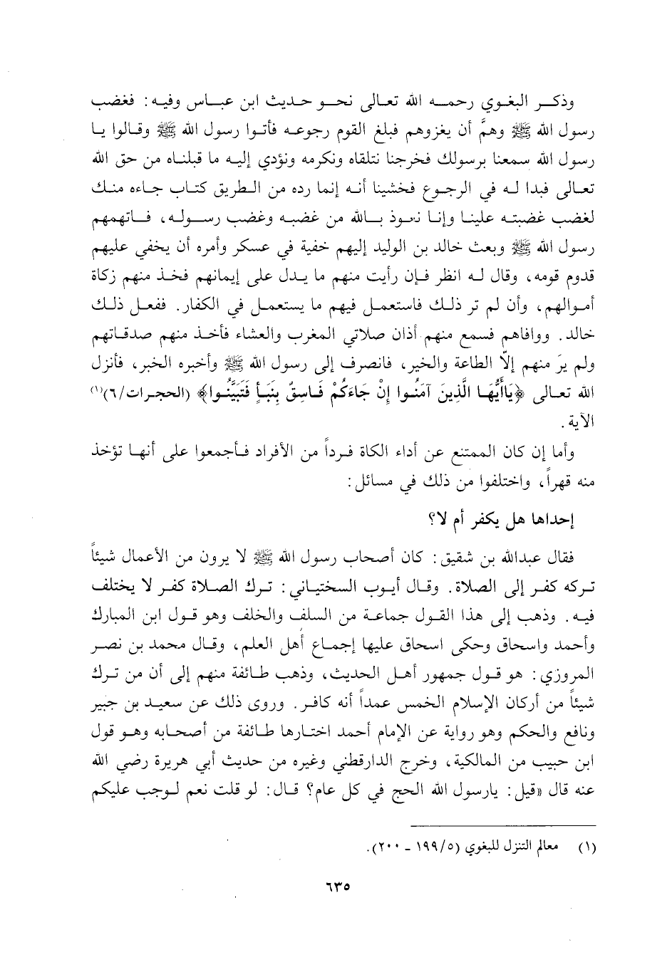 وَذَكَرَ الْبَغَوِيُّ رَحِمَهُ اللَّهُ تَعَالَى نَحْوَ حَدِيثِ ابْنِ عَبَّاسٍ وَفِيهِ: فَغَضِبَ رَسُولُ اللَّهِ صَلَّى اللَّهُ عَلَيْهِ وَسَلَّمَ وَهَمَّ أَنْ يَغْزُوَهُمْ فَبَلَغَ الْقَوْمَ رُجُوعُهُ فَأَتَوْا رَسُولَ اللَّهِ صَلَّى اللَّهُ عَلَيْهِ وَسَلَّمَ وَقَالُوا: يَا رَسُولَ اللَّهِ سَمِعْنَا بِرَسُولِكَ فَخَرَجْنَا نَتَلَقَّاهُ وَنُكْرِمُهُ وَنُؤَدِّي إِلَيْهِ مَا قَبِلْنَاهُ مِنْ حَقِّ اللَّهِ تَعَالَى, فَبَدَا لَهُ فِي الرُّجُوعِ فَخَشِينَا أَنَّهُ إِنَّمَا رَدَّهُ مِنَ الطَّرِيقِ كِتَابٌ جَاءَهُ مِنْكَ لِغَضَبٍ غَضِبْتَهُ عَلَيْنَا, وَإِنَّا نَعُوذُ بِاللَّهِ مِنْ غَضَبِهِ وَغَضَبِ رَسُولِهِ, فَاتَّهَمَهُمْ رَسُولُ اللَّهِ صَلَّى اللَّهُ عَلَيْهِ وَسَلَّمَ وَبَعَثَ خَالِدَ بْنَ الْوَلِيدِ إِلَيْهِمْ خُفْيَةً فِي عَسْكَرٍ وَأَمَرَهُ أَنْ يُخْفِيَ عَلَيْهِمْ قُدُومَ قَوْمِهِ, وَقَالَ لَهُ: انْظُرْ فَإِنْ رَأَيْتَ مِنْهُمْ مَا يَدُلُّ عَلَى إِيمَانِهِمْ فَخُذْ مِنْهُمْ زَكَاةَ أَمْوَالِهِمْ وَإِنْ لَمْ تَرَ ذَلِكَ فَاسْتَعْمِلْ فِيهِمْ مَا يُسْتَعْمَلُ فِي الْكُفَّارِ. فَفَعَلَ ذَلِكَ خَالِدٌ وَوَافَاهُمْ فَسَمِعَ مِنْهُمْ أَذَانَ صَلَاتَيِ الْمَغْرِبِ وَالْعَشَاءِ فَأَخَذَ مِنْهُمْ صَدَقَاتِهِمْ وَلَمْ يَرَ مِنْهُمْ إِلَّا الطَّاعَةَ وَالْخَيْرَ, فَانْصَرَفَ إِلَى رَسُولِ اللَّهِ صَلَّى اللَّهُ عَلَيْهِ وَسَلَّمَ وَأَخْبَرَهُ الْخَبَرَ, فَأَنْزَلَ اللَّهُ تَعَالَى: {يَا أَيُّهَا الَّذِينَ آمَنُوا إِنْ جَاءَكُمْ فَاسِقٌ بِنَبَإٍ فَتَبَيَّنُوا} [الْحُجُرَاتِ: 6] 1 الْآيَةَ.