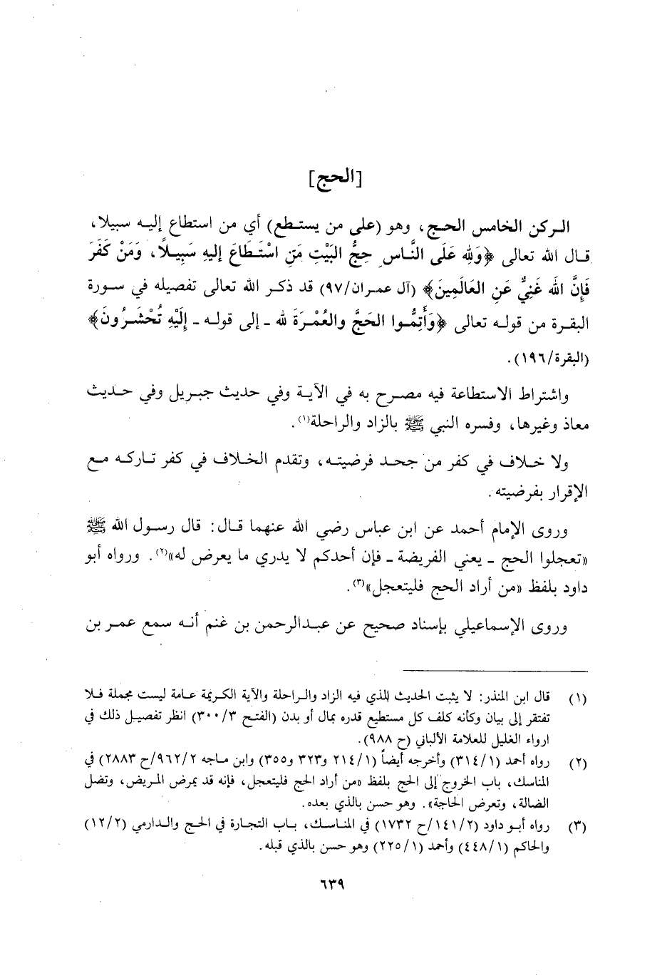 1 قال ابن المنذر: لا يثبت الحديث الذي فيه الزاد والراحلة, والآية الكريمة عامة ليست مجملة فلا تفتقر إلى بيان وكأنه كلف كل مستطيع قدره بمال أو بدن "الفتح 3/ 300". انظر تفصيل ذلك في إرواء الغليل للعلامة الألباني "ح988".