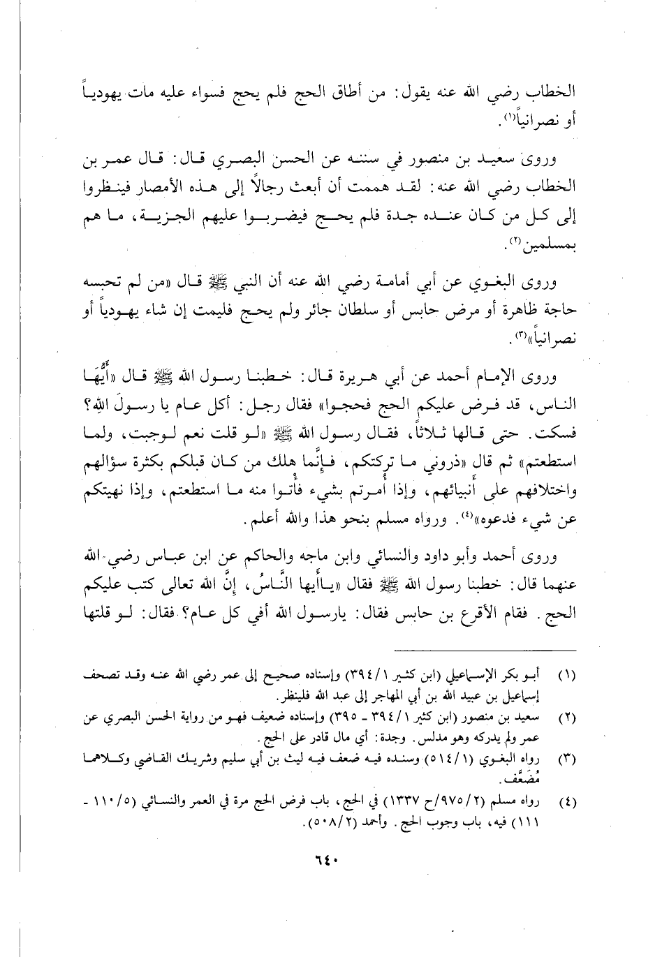 الْخَطَّابِ رَضِيَ اللَّهُ عَنْهُ يَقُولُ: مَنْ أَطَاقَ الْحَجَّ فَلَمْ يَحُجَّ, فَسَوَاءٌ عَلَيْهِ مَاتَ يَهُودِيًّا أَوْ نَصْرَانِيًّا1.