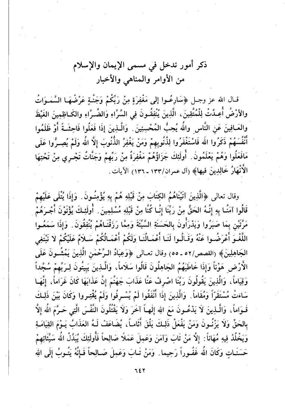 وَقَالَ تَعَالَى: {الَّذِينَ آتَيْنَاهُمُ الْكِتَابَ مِنْ قَبْلِهِ هُمْ بِهِ يُؤْمِنُونَ وَإِذَا يُتْلَى عَلَيْهِمْ قَالُوا آمَنَّا بِهِ إِنَّهُ الْحَقُّ مِنْ رَبِّنَا إِنَّا كُنَّا مِنْ قَبْلِهِ مُسْلِمِينَ أُولَئِكَ يُؤْتَوْنَ أَجْرَهُمْ مَرَّتَيْنِ بِمَا صَبَرُوا وَيَدْرَءُونَ بِالْحَسَنَةِ السَّيِّئَةَ وَمِمَّا رَزَقْنَاهُمْ يُنْفِقُونَ وَإِذَا سَمِعُوا اللَّغْوَ أَعْرَضُوا عَنْهُ وَقَالُوا لَنَا أَعْمَالُنَا وَلَكُمْ أَعْمَالُكُمْ سَلَامٌ عَلَيْكُمْ لَا نَبْتَغِي الْجَاهِلِينَ} [الْقَصَصِ: 52-55] وَقَالَ تَعَالَى: {وَعِبَادُ الرَّحْمَنِ الَّذِينَ يَمْشُونَ عَلَى الْأَرْضِ هَوْنًا وَإِذَا خَاطَبَهُمُ الْجَاهِلُونَ قَالُوا سَلَامًا وَالَّذِينَ يَبِيتُونَ لِرَبِّهِمْ سُجَّدًا وَقِيَامًا وَالَّذِينَ يَقُولُونَ رَبَّنَا اصْرِفْ عَنَّا عَذَابَ جَهَنَّمَ إِنَّ عَذَابَهَا كَانَ غَرَامًا إِنَّهَا سَاءَتْ مُسْتَقَرًّا وَمُقَامًا وَالَّذِينَ إِذَا أَنْفَقُوا لَمْ يُسْرِفُوا وَلَمْ يَقْتُرُوا وَكَانَ بَيْنَ ذَلِكَ قَوَامًا وَالَّذِينَ لَا يَدْعُونَ مَعَ اللَّهِ إِلَهًا آخَرَ وَلَا يَقْتُلُونَ النَّفْسَ الَّتِي حَرَّمَ اللَّهُ إِلَّا بِالْحَقِّ وَلَا يَزْنُونَ وَمَنْ يَفْعَلْ ذَلِكَ يَلْقَ أَثَامًا يُضَاعَفْ لَهُ الْعَذَابُ يَوْمَ الْقِيَامَةِ وَيَخْلُدْ فِيهِ مُهَانًا إِلَّا مَنْ تَابَ وَآمَنَ وَعَمِلَ عَمَلًا صَالِحًا فَأُولَئِكَ يُبَدِّلُ اللَّهُ سَيِّئَاتِهِمْ حَسَنَاتٍ وَكَانَ اللَّهُ غَفُورًا رَحِيمًا وَمَنْ تَابَ وَعَمِلَ صَالِحًا فَإِنَّهُ يَتُوبُ إِلَى اللَّهِ