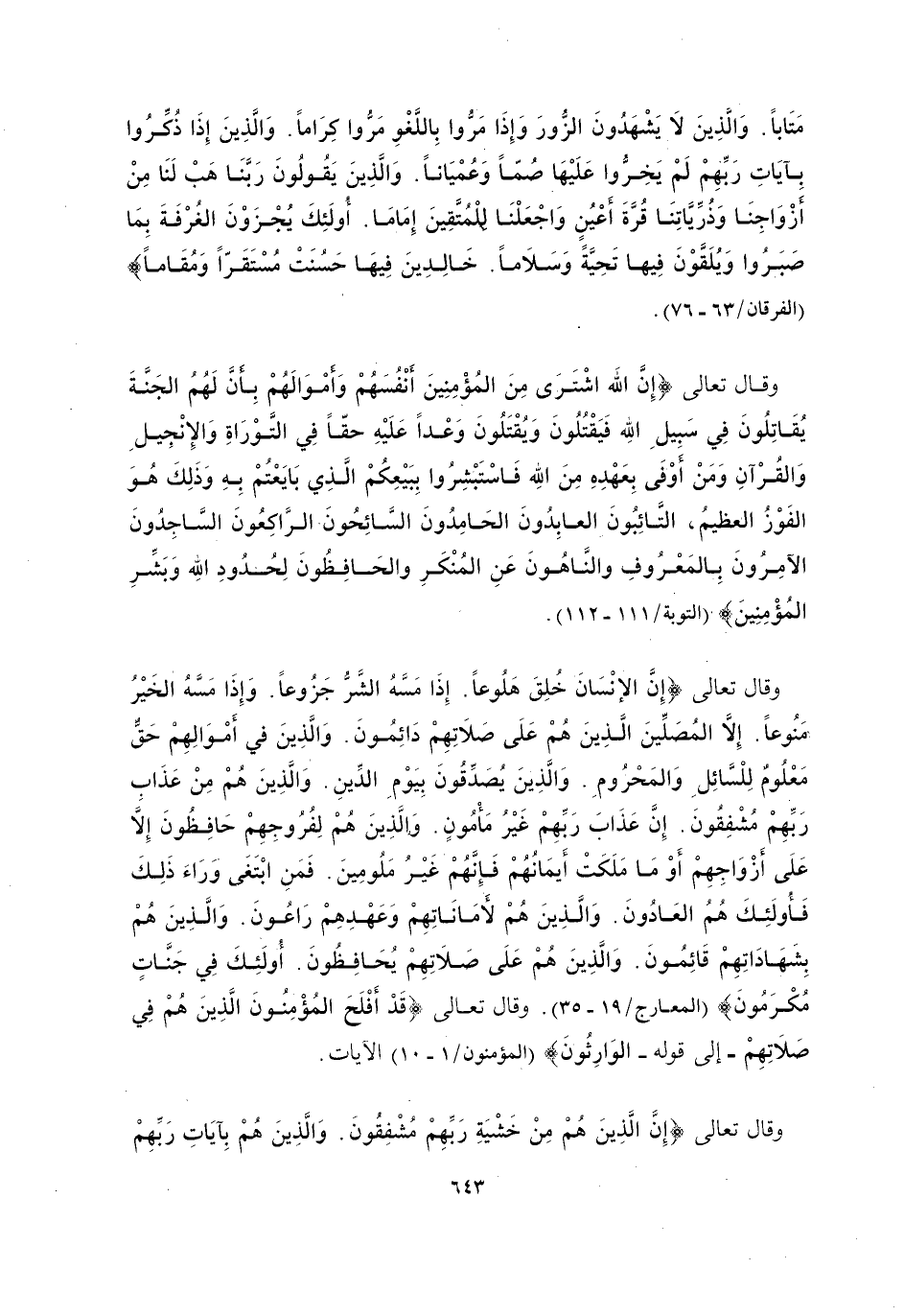 وَقَالَ تَعَالَى: {إِنَّ الْإِنْسَانَ خُلِقَ هَلُوعًا إِذَا مَسَّهُ الشَّرُّ جَزُوعًا وَإِذَا مَسَّهُ الْخَيْرُ مَنُوعًا إِلَّا الْمُصَلِّينَ الَّذِينَ هُمْ عَلَى صَلَاتِهِمْ دَائِمُونَ وَالَّذِينَ فِي أَمْوَالِهِمْ حَقٌّ مَعْلُومٌ لِلسَّائِلِ وَالْمَحْرُومِ وَالَّذِينَ يُصَدِّقُونَ بِيَوْمِ الدِّينِ وَالَّذِينَ هُمْ مِنْ عَذَابِ رَبِّهِمْ مُشْفِقُونَ إِنَّ عَذَابَ رَبِّهِمْ غَيْرُ مَأْمُونٍ وَالَّذِينَ هُمْ لِفُرُوجِهِمْ حَافِظُونَ إِلَّا عَلَى أَزْوَاجِهِمْ أَوْ مَا مَلَكَتْ أَيْمَانُهُمْ فَإِنَّهُمْ غَيْرُ مَلُومِينَ فَمَنِ ابْتَغَى وَرَاءَ ذَلِكَ فَأُولَئِكَ هُمُ الْعَادُونَ وَالَّذِينَ هُمْ لِأَمَانَاتِهِمْ وَعَهْدِهِمْ رَاعُونَ وَالَّذِينَ هُمْ بِشَهَادَاتِهِمْ قَائِمُونَ وَالَّذِينَ هُمْ عَلَى صَلَاتِهِمْ يُحَافِظُونَ أُولَئِكَ فِي جَنَّاتٍ مُكْرَمُونَ} [الْمَعَارِجِ: 19-35] وَقَالَ تَعَالَى: {قَدْ أَفْلَحَ الْمُؤْمِنُونَ الَّذِينَ هُمْ فِي صَلَاتِهِمْ} إِلَى قَوْلِهِ: {الْوَارِثُونَ} [الْمُؤْمِنُونَ: 1 10] الْآيَاتِ.