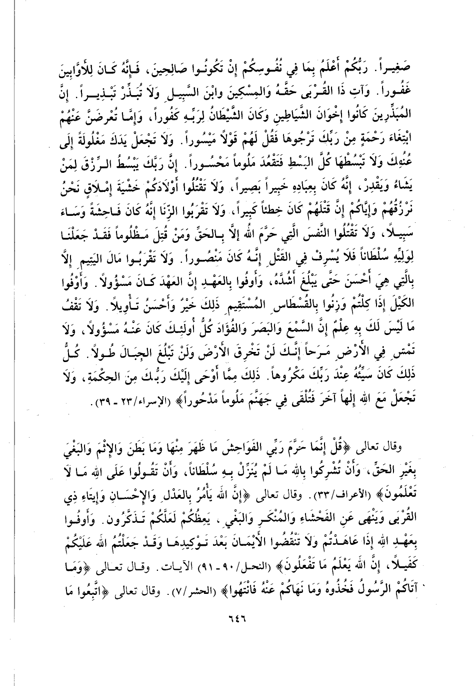 صَغِيرًا رَبُّكُمْ أَعْلَمُ بِمَا فِي نُفُوسِكُمْ إِنْ تَكُونُوا صَالِحِينَ فَإِنَّهُ كَانَ لِلْأَوَّابِينَ غَفُورًا وَآتِ ذَا الْقُرْبَى حَقَّهُ وَالْمِسْكِينَ وَابْنَ السَّبِيلِ وَلَا تُبَذِّرْ تَبْذِيرًا إِنَّ الْمُبَذِّرِينَ كَانُوا إِخْوَانَ الشَّيَاطِينِ وَكَانَ الشَّيْطَانُ لِرَبِّهِ كَفُورًا وَإِمَّا تُعْرِضَنَّ عَنْهُمُ ابْتِغَاءَ رَحْمَةٍ مِنْ رَبِّكَ تَرْجُوهَا فَقُلْ لَهُمْ قَوْلًا مَيْسُورًا وَلَا تَجْعَلْ يَدَكَ مَغْلُولَةً إِلَى عُنُقِكَ وَلَا تَبْسُطْهَا كُلَّ الْبَسْطِ فَتَقْعُدَ مَلُومًا مَحْسُورًا إِنَّ رَبَّكَ يَبْسُطُ الرِّزْقَ لِمَنْ يَشَاءُ وَيَقْدِرُ إِنَّهُ كَانَ بِعِبَادِهِ خَبِيرًا بَصِيرًا وَلَا تَقْتُلُوا أَوْلَادَكُمْ خَشْيَةَ إِمْلَاقٍ نَحْنُ نَرْزُقُهُمْ وَإِيَّاكُمْ إِنَّ قَتْلَهُمْ كَانَ خِطْئًا كَبِيرًا وَلا تَقْرَبُوا الزِّنَى إِنَّهُ كَانَ فَاحِشَةً وَسَاءَ سَبِيلًا وَلَا تَقْتُلُوا النَّفْسَ الَّتِي حَرَّمَ اللَّهُ إِلَّا بِالْحَقِّ وَمَنْ قُتِلَ مَظْلُومًا فَقَدْ جَعَلْنَا لِوَلِيِّهِ سُلْطَانًا فَلَا يُسْرِفْ فِي الْقَتْلِ إِنَّهُ كَانَ مَنْصُورًا وَلَا تَقْرَبُوا مَالَ الْيَتِيمِ إِلَّا بِالَّتِي هِيَ أَحْسَنُ حَتَّى يَبْلُغَ أَشُدَّهُ وَأَوْفُوا بِالْعَهْدِ إِنَّ الْعَهْدَ كَانَ مَسْؤُولًا وَأَوْفُوا الْكَيْلَ إِذَا كِلْتُمْ وَزِنُوا بِالْقِسْطَاسِ الْمُسْتَقِيمِ ذَلِكَ خَيْرٌ وَأَحْسَنُ تَأْوِيلًا وَلَا تَقْفُ مَا لَيْسَ لَكَ بِهِ عِلْمٌ إِنَّ السَّمْعَ وَالْبَصَرَ وَالْفُؤَادَ كُلُّ أُولَئِكَ كَانَ عَنْهُ مَسْؤُولًا وَلَا تَمْشِ فِي الْأَرْضِ مَرَحًا إِنَّكَ لَنْ تَخْرِقَ الْأَرْضَ وَلَنْ تَبْلُغَ الْجِبَالَ طُولًا كُلُّ ذَلِكَ كَانَ سَيِّئُهُ عِنْدَ رَبِّكَ مَكْرُوهًا ذَلِكَ مِمَّا أَوْحَى إِلَيْكَ رَبُّكَ مِنَ الْحِكْمَةِ وَلَا تَجْعَلْ مَعَ اللَّهِ إِلَهًا آخَرَ فَتُلْقَى فِي جَهَنَّمَ مَلُومًا مَدْحُورًا} [الْإِسْرَاءِ: 23-39] .