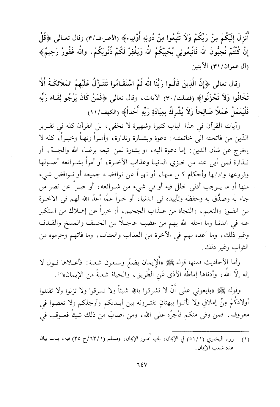 وَآيَاتُ الْقُرْآنِ فِي هَذَا الْبَابِ كَثِيرَةٌ وَشَهِيرَةٌ لَا تَخْفَى, بَلِ الْقُرْآنُ كُلُّهُ فِي تَقْرِيرِ الدِّينِ مِنْ فَاتِحَتِهِ إِلَى خَاتِمَتِهِ: دَعْوَةً وَبِشَارَةً وَنِذَارَةً, وَأَمْرًا وَنَهْيًا وَخَبَرًا , كُلُّهُ لَا يَخْرُجُ عَنْ شَأْنِ الدِّينِ: إِمَّا دَعْوَةً إِلَيْهِ أَوْ بِشَارَةً لِمَنِ اتَّبَعَهُ بِرِضَاءِ اللَّهِ وَالْجَنَّةِ أَوْ نِذَارَةً لِمَنْ أَبَى عَنْهُ مِنْ خِزْيِ الدُّنْيَا وَعَذَابِ الآخرة أو أمر بِشَرَائِعِهِ: أُصُولِهَا وَفُرُوعِهَا وَآدَابِهَا وَأَحْكَامِ كُلٍّ منها أو نهي عَنْ نَوَاقِضِهِ جَمِيعِهِ أَوْ نَوَاقِضِ شَيْءٍ مِنْهَا أَوْ مَا يُوجِبُ أَدْنَى خَلَلٍ فِيهِ أَوْ فِي شَيْءٍ مِنْ شرائعه أو خبر عَنْ نَصْرِ مَنْ جَاءَ بِهِ وَصَدَّقَ بِهِ وَحِفْظِهِ وَتَأْيِيدِهِ فِي الدنيا أو خبر عَمَّا أَعَدَّ اللَّهُ لَهُمْ فِي الْآخِرَةِ مِنَ الْفَوْزِ وَالنَّعِيمِ وَالنَّجَاةِ مِنْ عَذَابِ الجحيم أو خبر عَنْ إِهْلَاكِ مَنِ اسْتَكْبَرَ عَنْهُ فِي الدُّنْيَا وَمَا أَحَلَّهُ اللَّهُ بِهِمْ مِنْ غَضَبِهِ عَاجِلًا مِنَ الْخَسْفِ وَالْمَسْخِ وَالْقَذْفِ وَغَيْرِ ذَلِكَ, وَمَا أَعَدَّهُ لَهُمْ فِي الْآخِرَةِ مِنَ الْعَذَابِ وَالْعِقَابِ, وَمَا فَاتَهُمْ وَحُرِمُوهُ مِنَ الثَّوَابِ وَغَيْرِ ذَلِكَ.