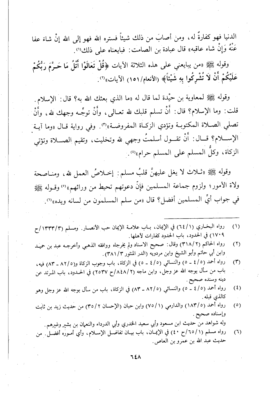 وَقَوْلُهُ صَلَّى اللَّهُ عَلَيْهِ وَسَلَّمَ لِمُعَاوِيَةَ بْنِ حَيْدَةَ لَمَّا قَالَ لَهُ: مَا الَّذِي بَعَثَكَ اللَّهُ بِهِ؟ قَالَ: "الْإِسْلَامُ" قُلْتُ: وَمَا الْإِسْلَامُ؟ قَالَ: "أَنَّ تُسْلِمَ قَلْبَكَ لِلَّهِ تَعَالَى وَأَنْ تُوَجِّهَ وَجْهَكَ لِلَّهِ وَأَنْ تُصَلِّيَ الصَّلَاةَ الْمَكْتُوبَةَ وَتُؤَدِّيَ الزَّكَاةَ الْمَفْرُوضَةَ" 3. وَفِي رِوَايَةٍ قَالَ: وَمَا آيَةُ الْإِسْلَامِ؟ قَالَ: "أَنْ تَقُولَ: أَسْلَمْتُ وَجْهِيَ لِلَّهِ وَتَخَلَّيْتُ, وَتُقِيمَ الصَّلَاةَ, وَتُؤْتِيَ الزَّكَاةَ, وَكُلُّ الْمُسْلِمِ عَلَى الْمُسْلِمِ حَرَامٌ" 4.