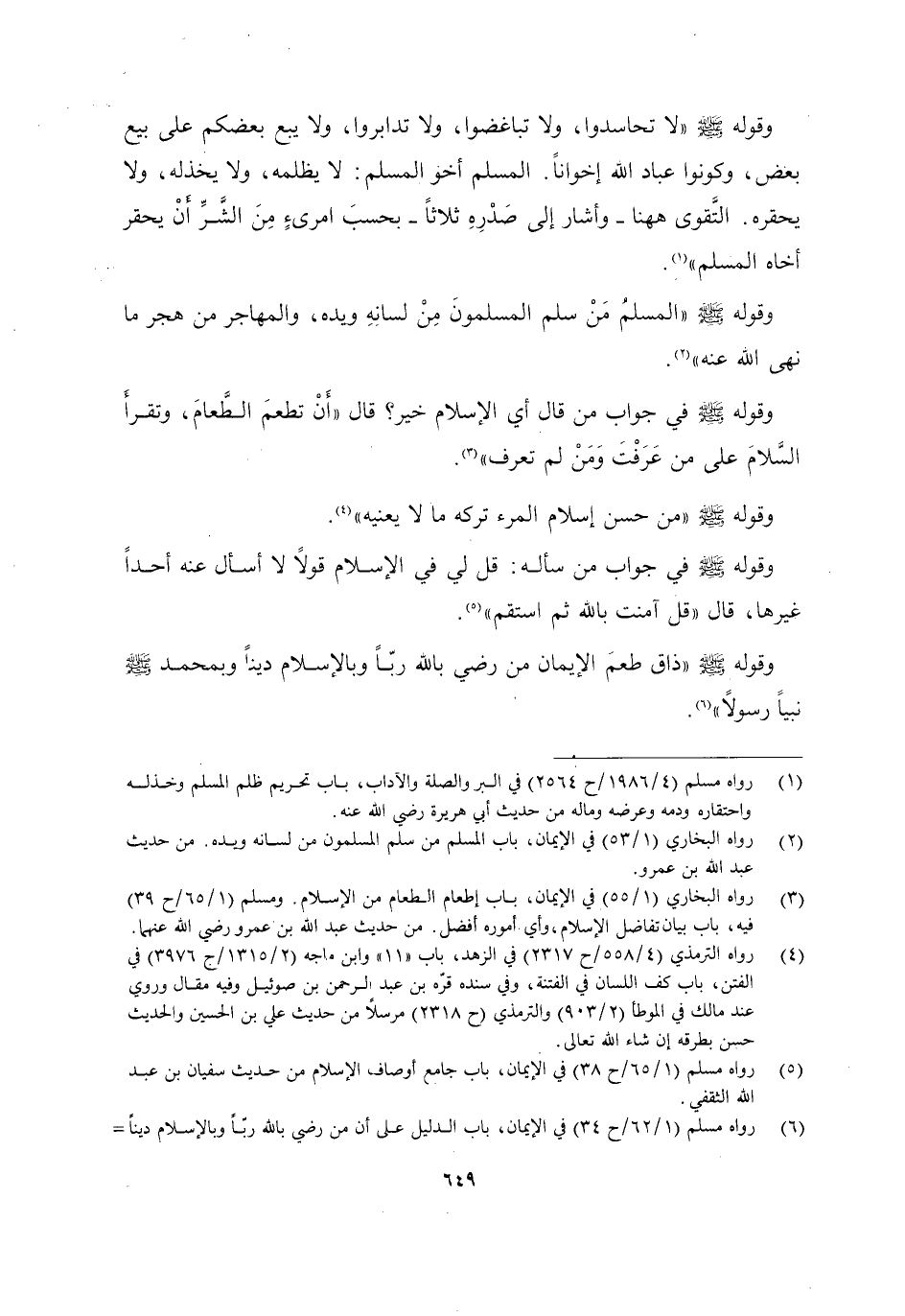 وَقَوْلُهُ صَلَّى اللَّهُ عَلَيْهِ وَسَلَّمَ: "لَا تَحَاسَدُوا, وَلَا تَبَاغَضُوا, وَلَا تَدَابَرُوا, وَلَا يَبِعْ بَعْضُكُمْ عَلَى بَيْعِ بَعْضٍ, وَكُونُوا عِبَادَ اللَّهِ إِخْوَانًا, الْمُسْلِمُ أَخُو الْمُسْلِمِ, لَا يَظْلِمُهُ وَلَا يَخْذُلُهُ وَلَا يحقره, التقوى ههنا -وَأَشَارَ إِلَى صَدْرِهِ ثَلَاثًا- بِحَسْبِ امْرِئٍ مِنَ الشَّرِّ أَنْ يَحْقِرَ أَخَاهُ الْمُسْلِمَ" 1.