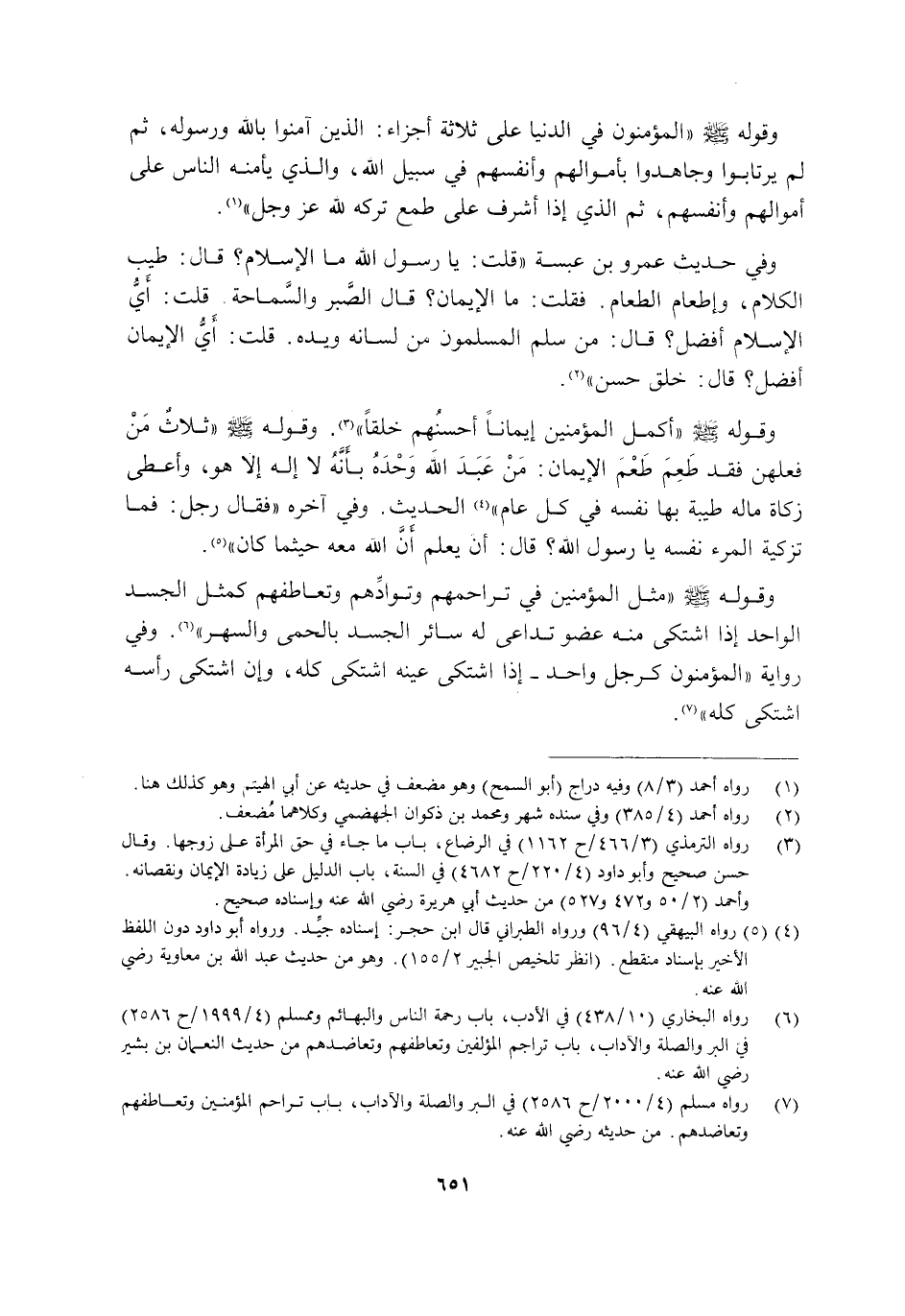 وَقَوْلُهُ صَلَّى اللَّهُ عَلَيْهِ وَسَلَّمَ: "أَكْمَلُ الْمُؤْمِنِينَ إِيمَانًا أَحْسَنُهُمْ خُلُقًا" 3. وَقَوْلُهُ صَلَّى اللَّهُ عَلَيْهِ وَسَلَّمَ: "ثَلَاثٌ مَنْ فَعَلَهُنَّ فَقَدْ طَعِمَ طَعْمَ الْإِيمَانِ: مَنْ عَبَدَ اللَّهَ وَحْدَهُ بِأَنَّهُ لَا إِلَهَ إِلَّا هُوَ وَأَعْطَى زَكَاةَ مَالِهِ طَيِّبَةً بِهَا نَفْسُهُ فِي كُلِّ عَامٍ" 4 الْحَدِيثَ وَفِي آخِرِهِ: فَقَالَ رَجُلٌ: فَمَا تَزْكِيَةُ الْمَرْءِ نَفْسَهُ يَا رَسُولَ اللَّهِ؟ قَالَ: "أَنْ يَعْلَمَ أَنَّ اللَّهَ مَعَهُ حَيْثُمَا كَانَ" 5.