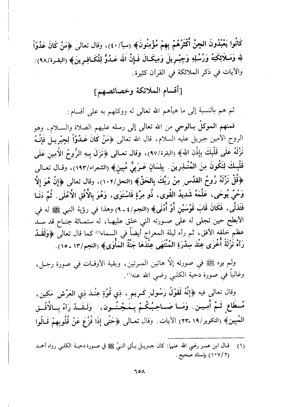 1 قال ابن عمر رضي الله عنهما: كان جبريل يأتي النبي -صَلَّى اللَّهُ عَلَيْهِ وَسَلَّمَ- في صورة دحية الكلبي. رواه أحمد "2/ 107" بإسناد صحيح.