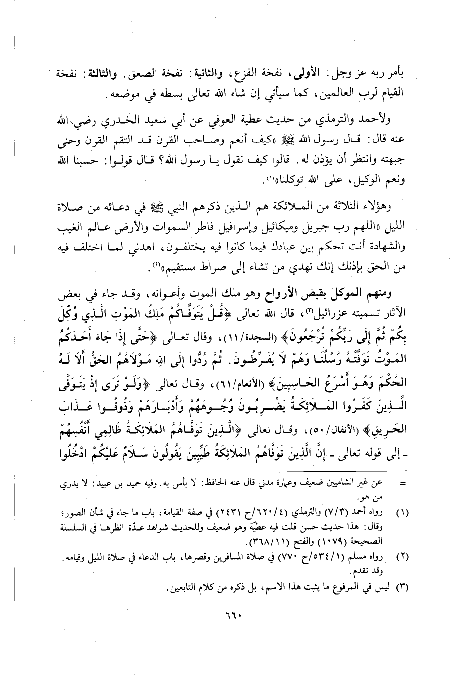 وَمِنْهُمُ الْمُوَكَّلُ بِقَبْضِ الْأَرْوَاحِ وَهُوَ مَلَكُ الْمَوْتِ وَأَعْوَانُهُ, وَقَدْ جَاءَ فِي بَعْضِ الْآثَارِ تَسْمِيَتُهُ عِزْرَائِيلَ3, قَالَ اللَّهُ تَعَالَى: {قُلْ يَتَوَفَّاكُمْ مَلَكُ الْمَوْتِ الَّذِي وُكِّلَ بِكُمْ ثُمَّ إِلَى رَبِّكُمْ تُرْجَعُونَ} [السَّجْدَةِ: 11] وَقَالَ تَعَالَى: {حَتَّى إِذَا جَاءَ أَحَدَكُمُ الْمَوْتُ تَوَفَّتْهُ رُسُلُنَا وَهُمْ لَا يُفَرِّطُونَ ثُمَّ رُدُّوا إِلَى اللَّهِ مَوْلَاهُمُ الْحَقِّ أَلَا لَهُ الْحُكْمُ وَهُوَ أَسْرَعُ الْحَاسِبِينَ} [الْأَنْعَامِ: 61] وَقَالَ تَعَالَى: {وَلَوْ تَرَى إِذْ يَتَوَفَّى الَّذِينَ كَفَرُوا الْمَلَائِكَةُ يَضْرِبُونَ وُجُوهَهُمْ وَأَدْبَارَهُمْ وَذُوقُوا عَذَابَ الْحَرِيقِ} [الْأَنْفَالِ: 50] وَقَالَ تَعَالَى: {الَّذِينَ تَوَفَّاهُمُ الْمَلَائِكَةُ ظَالِمِي أَنْفُسِهِمْ} إِلَى قَوْلِهِ تَعَالَى: {الَّذِينَ تَتَوَفَّاهُمُ الْمَلَائِكَةُ طَيِّبِينَ يَقُولُونَ سَلَامٌ عَلَيْكُمُ ادْخُلُوا