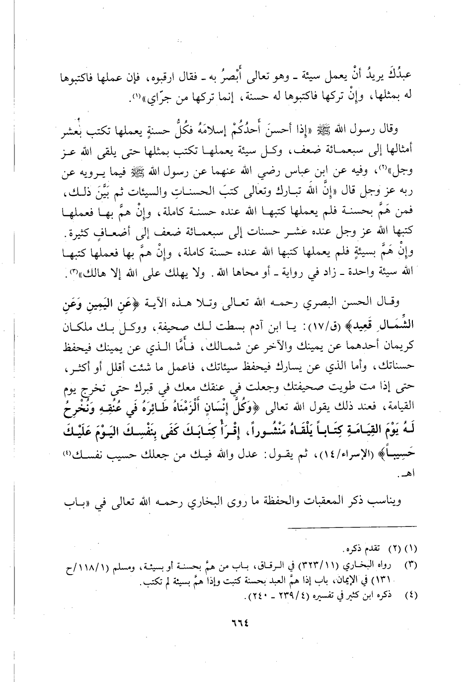 وَقَالَ رَسُولُ اللَّهِ صَلَّى اللَّهُ عَلَيْهِ وَسَلَّمَ: " إِذَا أَحْسَنَ أَحَدُكُمْ إِسْلَامَهُ فَكُلُّ حَسَنَةٍ يَعْمَلُهَا تُكْتَبُ بِعَشْرِ أَمْثَالِهَا إِلَى سَبْعِمِائَةِ ضِعْفٍ, وَكُلُّ سَيِّئَةٍ يَعْمَلُهَا تُكْتَبُ بِمِثْلِهَا حَتَّى يَلْقَى اللَّهَ عَزَّ وَجَلَّ" 2. وَفِيهِ عَنِ ابْنِ عَبَّاسٍ رَضِيَ اللَّهُ عَنْهُمَا عَنْ رَسُولِ اللَّهِ صَلَّى اللَّهُ عَلَيْهِ وَسَلَّمَ فِيمَا يَرْوِيهِ عَنْ رَبِّهِ عَزَّ وَجَلَّ قَالَ: "إِنَّ اللَّهَ تَبَارَكَ وَتَعَالَى كَتَبَ الْحَسَنَاتِ وَالسَّيِّئَاتِ ثُمَّ بَيَّنَ ذَلِكَ, فَمَنْ هَمَّ بِحَسَنَةٍ فَلَمْ يَعْمَلْهَا كَتَبَهَا اللَّهُ عِنْدَهُ حَسَنَةً كَامِلَةً, وَإِنْ هَمَّ بِهَا فَعَمِلَهَا كَتَبَهَا اللَّهُ عَزَّ وَجَلَّ عِنْدَهُ عَشْرَ حَسَنَاتٍ إِلَى سَبْعِمِائَةِ ضِعْفٍ إِلَى أَضْعَافٍ كَثِيرَةٍ. وَإِنْ هَمَّ بِسَيِّئَةٍ فَلَمْ يَعْمَلْهَا كَتَبَهَا اللَّهُ عِنْدَهُ حَسَنَةً كَامِلَةً, وَإِنْ هَمَّ بِهَا فَعَمِلَهَا كَتَبَهَا اللَّهُ سَيِّئَةً وَاحِدَةً -زَادَ فِي رِوَايَةٍ: أَوْ مَحَاهَا اللَّهُ- وَلَا يَهْلَكُ عَلَى اللَّهِ إِلَّا هَالِكٌ" 3.