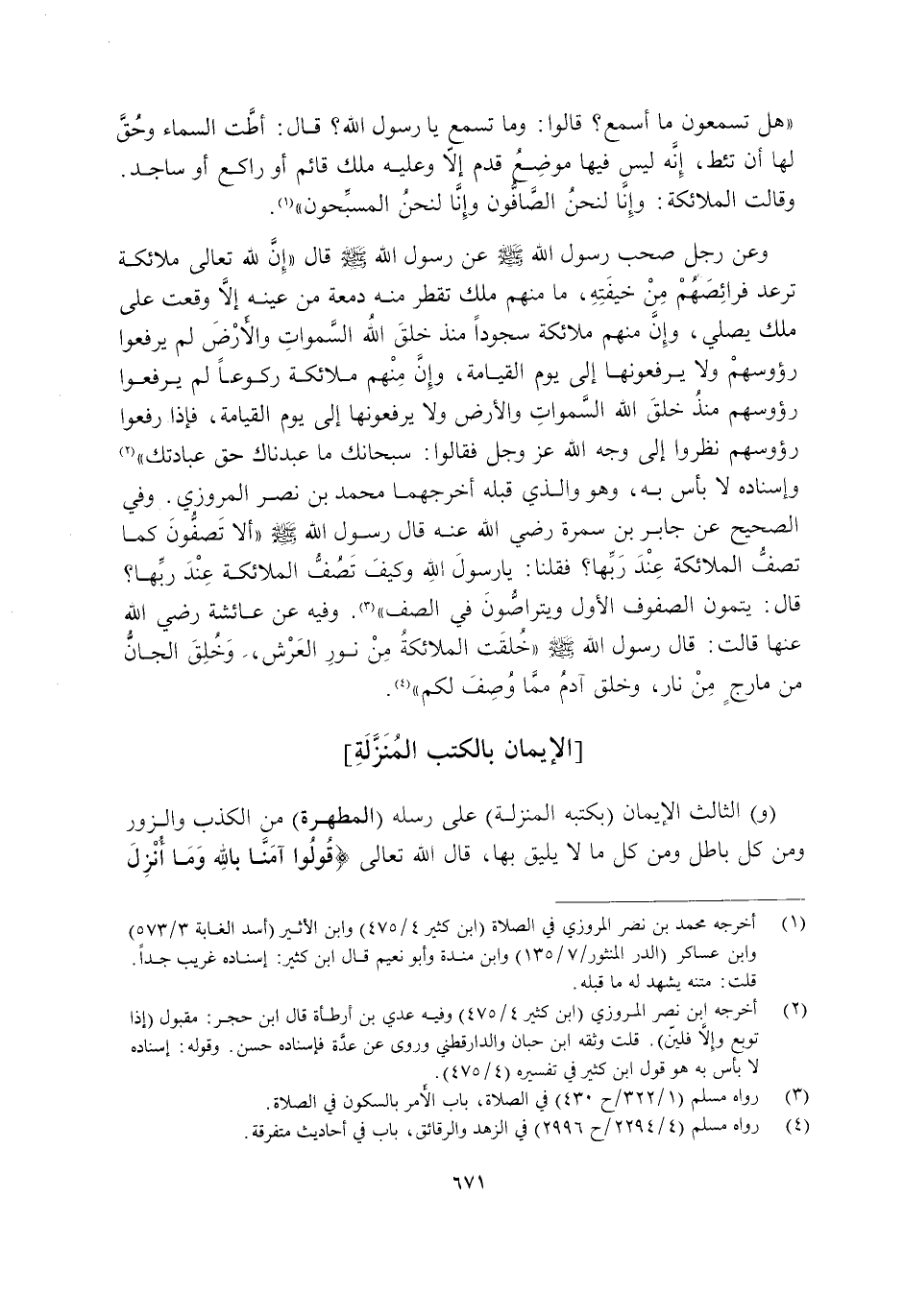 وَعَنْ رَجُلٍ صَحِبَ رَسُولَ اللَّهِ -صَلَّى اللَّهُ عَلَيْهِ وَسَلَّمَ- عَنْ رَسُولِ اللَّهِ -صَلَّى اللَّهُ عَلَيْهِ وَسَلَّمَ- قَالَ: "إِنَّ لِلَّهِ تَعَالَى مَلَائِكَةً تَرْعَدُ فَرَائِصُهُمْ مِنْ خِيفَتِهِ, ما مِنْهُمْ مَلَكٌ تَقْطُرُ مِنْهُ دمعة من عينه إِلَّا وَقَعَتْ عَلَى مَلَكٍ يُصَلِّي, وَإِنَّ مِنْهُمْ مَلَائِكَةً سُجُودًا مُنْذُ خَلَقَ اللَّهُ السَّمَاوَاتِ وَالْأَرْضَ لَمْ يَرْفَعُوا رُءُوسَهُمْ وَلَا يَرْفَعُونَهَا إِلَى يَوْمِ الْقِيَامَةِ, وَإِنَّ مِنْهُمْ مَلَائِكَةً رُكُوعًا لَمْ يَرْفَعُوا رُءُوسَهُمْ مُنْذُ خَلَقَ اللَّهُ السَّمَاوَاتِ وَالْأَرْضَ وَلَا يَرْفَعُونَهَا إِلَى يَوْمِ الْقِيَامَةِ, فَإِذَا رَفَعُوا رُءُوسَهُمْ نَظَرُوا إِلَى وَجْهِ اللَّهِ عَزَّ وَجَلَّ فَقَالُوا: سُبْحَانَكَ مَا عَبَدْنَاكَ حَقَّ عِبَادَتِكَ" 2. وَإِسْنَادُهُ لَا بَأْسَ بِهِ, وَهُوَ وَالَّذِي قَبْلَهُ أَخْرَجَهُمَا مُحَمَّدُ بْنُ نَصْرٍ الْمَرْوَزِيُّ, وَفِي الصَّحِيحِ عَنْ جَابِرِ بْنِ سَمُرَةَ رَضِيَ اللَّهُ عَنْهُ قَالَ رَسُولُ اللَّهِ صَلَّى اللَّهُ عَلَيْهِ وَسَلَّمَ: "أَلَا تَصُفُّونَ كَمَا تَصُفُّ الْمَلَائِكَةُ عِنْدَ رَبِّهَا "؟ فَقُلْنَا: يَا رَسُولَ اللَّهِ وَكَيْفَ تَصُفُّ الْمَلَائِكَةُ عِنْدَ رَبِّهَا؟ قَالَ: "يُتِمُّونَ الصُّفُوفَ الْأُوَلَ, وَيَتَرَاصُّونَ فِي الصَّفِّ" 3. وَفِيهِ عَنْ عَائِشَةَ رَضِيَ اللَّهُ عَنْهَا قَالَتْ: قَالَ رَسُولُ اللَّهِ صَلَّى اللَّهُ عَلَيْهِ وَسَلَّمَ: "خُلِقَتِ الْمَلَائِكَةُ مِنْ نُورِ الْعَرْشِ, وَخُلِقَ الْجَانُّ مِنْ مَارِجٍ مِنْ نَارٍ, وَخُلِقَ آدَمُ مِمَّا وُصِفَ لَكُمْ" 4.