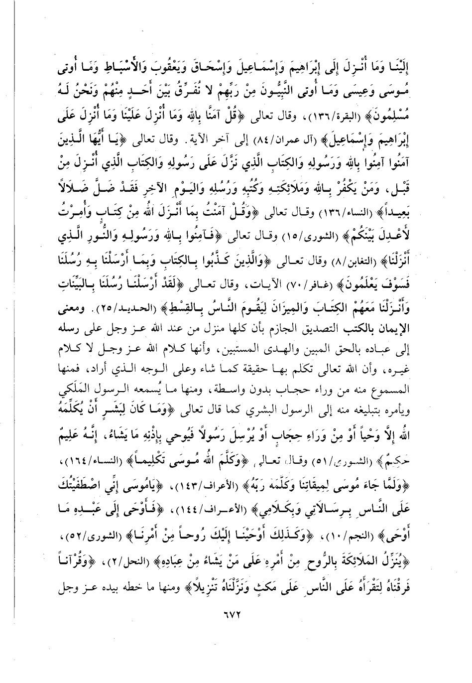 {إِلَيْنَا وَمَا أُنْزِلَ إِلَى إِبْرَاهِيمَ وَإِسْمَاعِيلَ وَإِسْحَاقَ وَيَعْقُوبَ وَالْأَسْبَاطِ وَمَا أُوتِيَ مُوسَى وَعِيسَى وَمَا أُوتِيَ النَّبِيُّونَ مِنْ رَبِّهِمْ لَا نُفَرِّقُ بَيْنَ أَحَدٍ مِنْهُمْ وَنَحْنُ لَهُ مُسْلِمُونَ} [الْبَقَرَةِ: 136] وَقَالَ تَعَالَى: {قُلْ آمَنَّا بِاللَّهِ وَمَا أُنْزِلَ عَلَيْنَا وَمَا أُنْزِلَ عَلَى إِبْرَاهِيمَ وَإِسْمَاعِيلَ} [آلِ عِمْرَانَ: 84] إِلَى آخِرِ الْآيَةِ. وَقَالَ تَعَالَى: {يَا أَيُّهَا الَّذِينَ آمَنُوا آمِنُوا بِاللَّهِ وَرَسُولِهِ وَالْكِتَابِ الَّذِي نَزَّلَ عَلَى رَسُولِهِ وَالْكِتَابِ الَّذِي أَنْزَلَ مِنْ قَبْلُ وَمَنْ يَكْفُرْ بِاللَّهِ وَمَلَائِكَتِهِ وَكُتُبِهِ وَرُسُلِهِ وَالْيَوْمِ الْآخِرِ فَقَدْ ضَلَّ ضَلَالًا بَعِيدًا} [النِّسَاءِ: 136] وَقَالَ تَعَالَى: {وَقُلْ آمَنْتُ بِمَا أَنْزَلَ اللَّهُ مِنْ كِتَابٍ وَأُمِرْتُ لِأَعْدِلَ بَيْنَكُمُ} [الشُّورَى: 15] وَقَالَ تَعَالَى: {فَآمِنُوا بِاللَّهِ وَرَسُولِهِ وَالنُّورِ الَّذِي أَنْزَلْنَا} [التَّغَابُنِ: 8] وَقَالَ تَعَالَى: {الَّذِينَ كَذَّبُوا بِالْكِتَابِ وَبِمَا أَرْسَلْنَا بِهِ رُسُلَنَا فَسَوْفَ يَعْلَمُونَ} [غَافِرٍ: 70] الْآيَاتِ, وَقَالَ تَعَالَى: {لَقَدْ أَرْسَلْنَا رُسُلَنَا بِالْبَيِّنَاتِ وَأَنْزَلْنَا مَعَهُمُ الْكِتَابَ وَالْمِيزَانَ لِيَقُومَ النَّاسُ بِالْقِسْطِ} [الْحَدِيدِ: 25] . وَمَعْنَى الْإِيمَانِ بِالْكُتُبِ التَّصْدِيقُ الْجَازِمُ بِأَنَّ كُلَّهَا مُنَزَّلٌ مِنْ عِنْدِ اللَّهِ عَزَّ وَجَلَّ عَلَى رُسُلِهِ إِلَى عِبَادِهِ بِالْحَقِّ الْمُبِينِ وَالْهُدَى الْمُسْتَبِينِ, وَأَنَّهَا كَلَامُ اللَّهِ عَزَّ وَجَلَّ لَا كَلَامَ غَيْرِهِ, وَأَنَّ اللَّهَ تَعَالَى تَكَلَّمَ بِهَا حَقِيقَةً كَمَا شَاءَ وَعَلَى الْوَجْهِ الَّذِي أَرَادَ, فَمِنْهَا الْمَسْمُوعُ مِنْهُ مِنْ وَرَاءِ حِجَابٍ بِدُونِ وَاسِطَةٍ, وَمِنْهَا مَا يَسْمَعُهُ الرَّسُولُ الْمَلَكِيُّ وَيَأْمُرُهُ بِتَبْلِيغِهِ مِنْهُ إِلَى الرَّسُولِ الْبَشَرِيِّ كَمَا قَالَ تَعَالَى: {وَمَا كَانَ لِبَشَرٍ أَنْ يُكَلِّمَهُ اللَّهُ إِلَّا وَحْيًا أَوْ مِنْ وَرَاءِ حِجَابٍ أَوْ يُرْسِلَ رَسُولًا فَيُوحِيَ بِإِذْنِهِ مَا يَشَاءُ إِنَّهُ عَلِيٌّ حَكِيمٌ} [الشُّورَى: 51] وَقَالَ تَعَالَى: {وَكَلَّمَ اللَّهُ مُوسَى تَكْلِيمًا} [النِّسَاءِ: 164] ، {وَلَمَّا جَاءَ مُوسَى لِمِيقَاتِنَا وَكَلَّمَهُ رَبُّهُ} [الْأَعْرَافِ: 143] ، {يَا مُوسَى إِنِّي اصْطَفَيْتُكَ عَلَى النَّاسِ بِرِسَالَاتِي وَبِكَلَامِي} [الْأَعْرَافِ: 144] ، {فَأَوْحَى إِلَى عَبْدِهِ مَا أَوْحَى} [النَّجْمِ: 10] ، {وَكَذَلِكَ أَوْحَيْنَا إِلَيْكَ رُوحًا مِنْ أَمْرِنَا} [الشُّورَى: 52] ، {يُنَزِّلُ الْمَلَائِكَةَ بِالرُّوحِ مِنْ أَمْرِهِ عَلَى مَنْ يَشَاءُ مِنْ عِبَادِهِ} [النَّحْلِ: 2] ، {وَقُرْآنًا فَرَقْنَاهُ لِتَقْرَأَهُ عَلَى النَّاسِ عَلَى مُكْثٍ وَنَزَّلْنَاهُ تَنْزِيلًا} وَمِنْهَا مَا خَطَّهُ بِيَدِهِ عَزَّ وَجَلَّ.