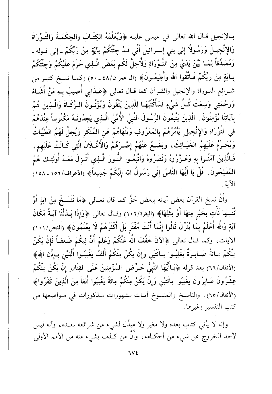 بِالْإِنْجِيلِ قَالَ اللَّهُ تَعَالَى فِي عيسى عليه السلام: {وَيُعَلِّمُهُ الْكِتَابَ وَالْحِكْمَةَ وَالتَّوْرَاةَ وَالْإِنْجِيلَ وَرَسُولًا إِلَى بَنِي إِسْرَائِيلَ أَنِّي قَدْ جِئْتُكُمْ بِآيَةٍ مِنْ رَبِّكُمْ} إِلَى قَوْلِهِ: {وَمُصَدِّقًا لِمَا بَيْنَ يَدَيَّ مِنَ التَّوْرَاةِ وَلِأُحِلَّ لَكُمْ بَعْضَ الَّذِي حُرِّمَ عَلَيْكُمْ وَجِئْتُكُمْ بِآيَةٍ مِنْ رَبِّكُمْ فَاتَّقُوا اللَّهَ وَأَطِيعُونِ} [آلِ عِمْرَانَ: 48-50] ، وَكَمَا نُسِخَ كَثِيرٌ مِنْ شَرَائِعِ التَّوْرَاةِ وَالْإِنْجِيلِ وَالْقُرْآنِ كَمَا قَالَ تَعَالَى: {عَذَابِي أُصِيبُ بِهِ مَنْ أَشَاءُ وَرَحْمَتِي وَسِعَتْ كُلَّ شَيْءٍ فَسَأَكْتُبُهَا لِلَّذِينَ يَتَّقُونَ وَيُؤْتُونَ الزَّكَاةَ وَالَّذِينَ هُمْ بِآيَاتِنَا يُؤْمِنُونَ الَّذِينَ يَتَّبِعُونَ الرَّسُولَ النَّبِيَّ الْأُمِّيَّ الَّذِي يَجِدُونَهُ مَكْتُوبًا عِنْدَهُمْ فِي التَّوْرَاةِ وَالْإِنْجِيلِ يَأْمُرُهُمْ بِالْمَعْرُوفِ وَيَنْهَاهُمْ عَنِ الْمُنْكَرِ وَيُحِلُّ لَهُمُ الطَّيِّبَاتِ وَيُحَرِّمُ عَلَيْهِمُ الْخَبَائِثَ وَيَضَعُ عَنْهُمْ إِصْرَهُمْ وَالْأَغْلَالَ الَّتِي كَانَتْ عَلَيْهِمْ فَالَّذِينَ آمَنُوا بِهِ وَعَزَّرُوهُ وَنَصَرُوهُ وَاتَّبَعُوا النُّورَ الَّذِي أُنْزِلَ مَعَهُ أُولَئِكَ هُمُ الْمُفْلِحُونَ قُلْ يَا أَيُّهَا النَّاسُ إِنِّي رَسُولُ اللَّهِ إِلَيْكُمْ جَمِيعًا} [الْأَعْرَافِ: 156-158] الْآيَةَ.