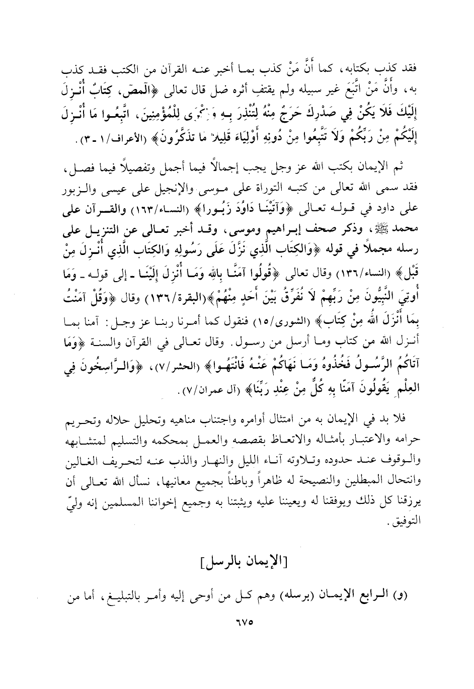ثُمَّ الْإِيمَانُ بِكُتُبِ اللَّهِ عَزَّ وَجَلَّ يَجِبُ إِجْمَالًا فِيمَا أَجْمَلَ وَتَفْصِيلًا فِيمَا فَصَّلَ, فَقَدْ سَمَّى اللَّهُ تَعَالَى مِنْ كُتُبِهِ التَّوْرَاةَ عَلَى مُوسَى وَالْإِنْجِيلَ عَلَى عِيسَى وَالزَّبُورَ عَلَى دَاوُدَ فِي قَوْلِهِ تَعَالَى: {وَآتَيْنَا دَاوُدَ زَبُورًا} [النِّسَاءِ: 163] وَالْقُرْآنَ عَلَى مُحَمَّدٍ صَلَّى اللَّهُ عَلَيْهِ وَسَلَّمَ, وَذَكَرَ صُحُفَ إِبْرَاهِيمَ وَمُوسَى, وَقَدْ أَخْبَرَ تَعَالَى عَنِ التَّنْزِيلِ عَلَى رُسُلِهِ مُجْمَلًا فِي قَوْلِهِ: {وَالْكِتَابِ الَّذِي نَزَّلَ عَلَى رَسُولِهِ وَالْكِتَابِ الَّذِي أَنْزَلَ مِنْ قَبْلُ} [النِّسَاءِ: 136] وَقَالَ تَعَالَى: {قُولُوا آمَنَّا بِاللَّهِ وَمَا أُنْزِلَ إِلَيْنَا} إِلَى قَوْلِهِ: {وَمَا أُوتِيَ النَّبِيُّونَ مِنْ رَبِّهِمْ لَا نُفَرِّقُ بَيْنَ أَحَدٍ مِنْهُمْ} [الْبَقَرَةِ: 136] وَقَالَ: {وَقُلْ آمَنْتُ بِمَا أَنْزَلَ اللَّهُ مِنْ كِتَابٍ} [الشُّورَى: 15] فَنَقُولُ كَمَا أَمَرَنَا رَبُّنَا عَزَّ وَجَلَّ: آمَنَّا بِمَا أَنْزَلَ اللَّهُ مِنْ كِتَابٍ وَمَا أَرْسَلَ مِنْ رَسُولٍ, وَقَالَ تَعَالَى فِي الْقُرْآنِ وَالسُّنَّةِ: {وَمَا آتَاكُمُ الرَّسُولُ فَخُذُوهُ وَمَا نَهَاكُمْ عَنْهُ فَانْتَهُوا} [الْحَشْرِ: 7] ، {وَالرَّاسِخُونَ فِي الْعِلْمِ يَقُولُونَ آمَنَّا بِهِ كُلٌّ مِنْ عِنْدِ رَبِّنَا} [آلِ عِمْرَانَ: 7] .