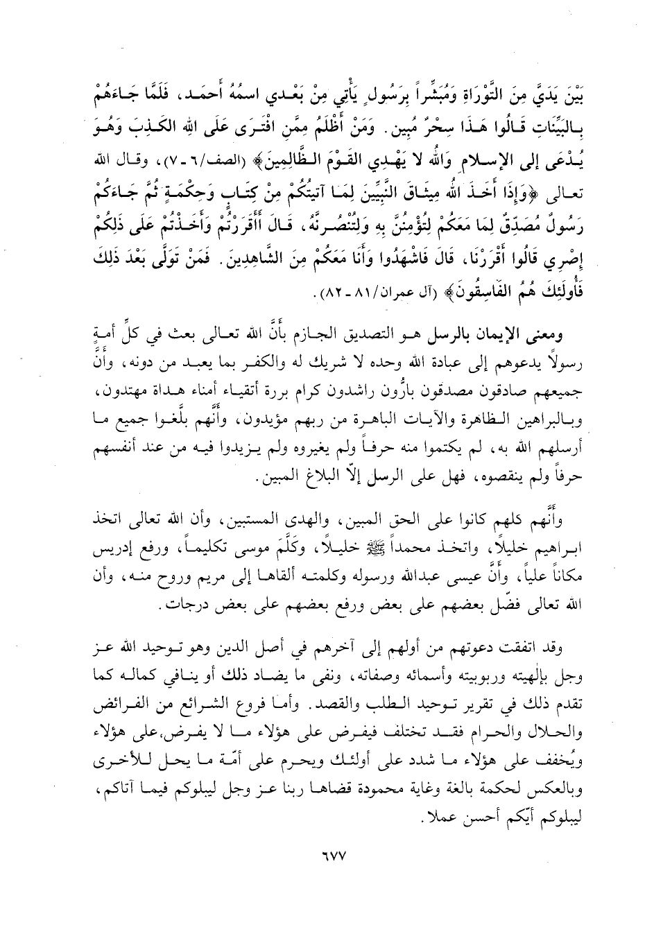 وَأَنَّهُمْ كُلَّهُمْ كَانُوا عَلَى الْحَقِّ الْمُبِينِ وَالْهُدَى الْمُسْتَبِينِ, وَأَنَّ اللَّهَ تَعَالَى اتَّخَذَ إِبْرَاهِيمَ خَلِيلًا وَاتَّخَذَ مُحَمَّدًا -صَلَّى اللَّهُ عَلَيْهِ وَسَلَّمَ- خَلِيلًا, وَكَلَّمَ مُوسَى تَكْلِيمًا, وَرَفَعَ إِدْرِيسَ مَكَانًا عَلِيًّا, وَأَنَّ عِيسَى عَبْدُ اللَّهِ وَرَسُولُهُ وَكَلِمَتُهُ أَلْقَاهَا إِلَى مَرْيَمَ وَرُوحٌ مِنْهُ, وَأَنَّ اللَّهَ تَعَالَى فَضَّلَ بَعْضَهُمْ على بعض ورفع بعضهم عَلَى بَعْضٍ دَرَجَاتٍ.
