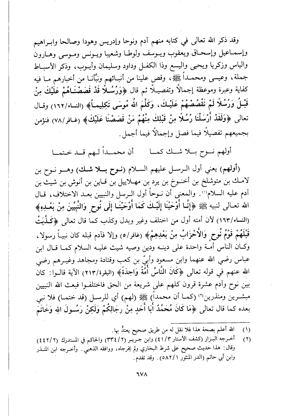 أَوَّلُهُمْ نُوحٌ بِلَا شَكٍّ كَمَا ... أَنَّ مُحَمَّدًا لَهُمْ قَدْ خَتَمَا