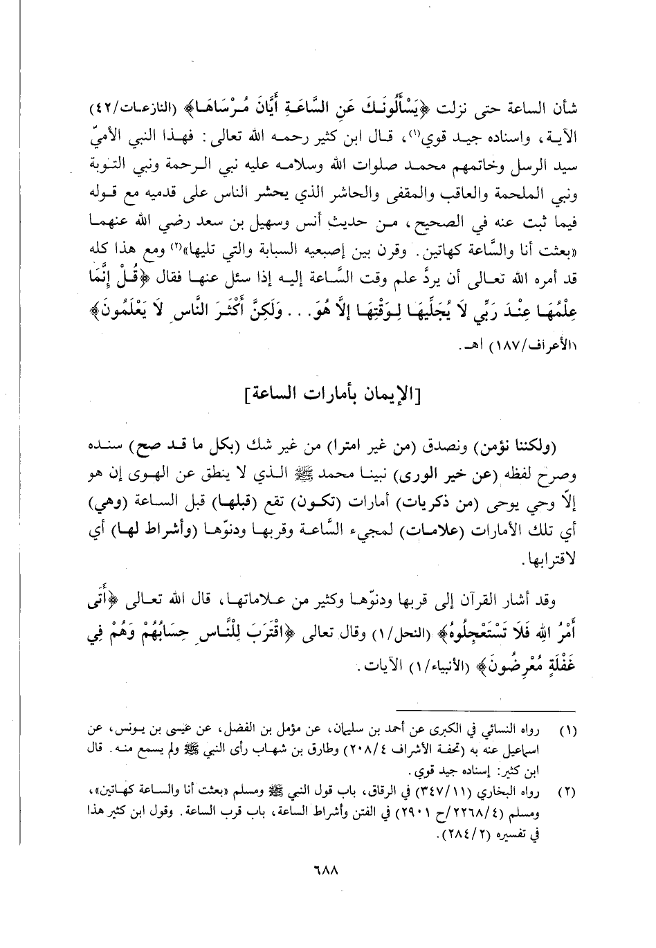"وَلَكِنَّنَا نُؤْمِنُ" وَنُصَدِّقُ "مِنْ غَيْرِ امْتِرَا" مِنْ غَيْرِ شَكِّ "بِكُلِّ مَا قَدْ صَحَّ" سَنَدُهُ وَصَرُحَ لَفْظُهُ "عَنْ خَيْرِ الْوَرَى" نَبِيِّنَا مُحَمَّدٍ -صَلَّى اللَّهُ عَلَيْهِ وَسَلَّمَ- الَّذِي لَا يَنْطِقُ عَنِ الْهَوَى إِنْ هُوَ إِلَّا وَحْيٌ يوحى "من ذكر آيات" أَمَارَاتٍ "تَكُونُ" تَقَعُ "قَبْلَهَا" قَبْلَ السَّاعَةِ "وَهِيَ" أَيْ: تِلْكَ الْأَمَارَاتُ "عَلَامَاتٌ" لِمَجِيءِ السَّاعَةِ وَقُرْبِهَا وَدُنُوِّهَا "وَأَشْرَاطٌ لَهَا" أَيْ: لِاقْتِرَابِهَا.
