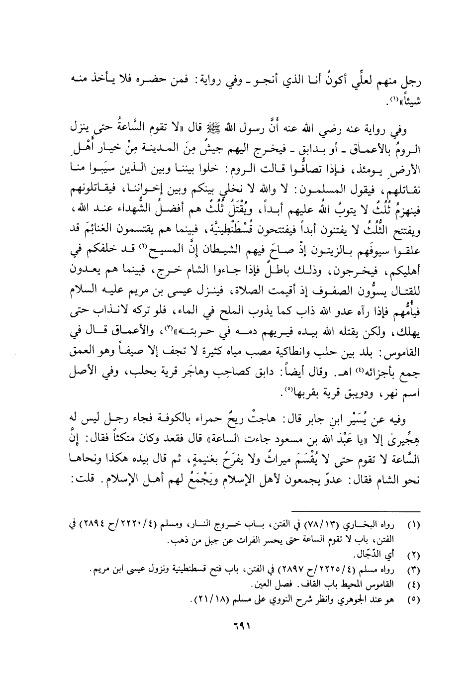 رَجُلٍ مِنْهُمْ لَعَلِّي أَكُونُ أَنَا الَّذِي أَنْجُو ". وَفِي رِوَايَةٍ: فَمَنْ حَضَرَهُ فَلَا يَأْخُذْ مِنْهُ شَيْئًا " 1. وَفِي رِوَايَةٍ عَنْهُ رَضِيَ اللَّهُ عَنْهُ أَنَّ رَسُولَ اللَّهِ صَلَّى اللَّهُ عَلَيْهِ وَسَلَّمَ قَالَ: " لَا تَقُومُ السَّاعَةُ حَتَّى يَنْزِلَ الرُّومُ بِالْأَعْمَاقِ - أَوْ بِدَابَقَ - فَيَخْرُجُ إِلَيْهِمْ جَيْشٌ مِنَ الْمَدِينَةِ مِنْ خِيَارِ أَهْلِ الْأَرْضِ يَوْمَئِذٍ، فَإِذَا تَصَافُّوا قَالَتِ الرُّومُ: خَلُّوا بَيْنَنَا وَبَيْنَ الَّذِينَ سَيَّبُوا مِنَّا نُقَاتِلْهُمْ، فَيَقُولُ الْمُسْلِمُونَ: لَا وَاللَّهِ لَا نُخَلِّي بَيْنَكُمْ وَبَيْنَ إِخْوَانِنَا فَيُقَاتِلُونَهُمْ، فَيَنْهَزِمُ ثُلُثٌ لَا يَتُوبُ اللَّهُ عَلَيْهِمْ أَبَدًا، وَيُقْتَلُ ثُلُثٌ هُمْ أَفْضَلُ الشُّهَدَاءِ عِنْدَ اللَّهِ، وَيَفْتَتِحُ الثُّلْثُ لَا يُفْتَنُونَ أَبَدًا فَيَفْتَتِحُونَ قُسْطَنْطِينِيَّةَ، فَبَيْنَمَا هُمْ يَقْتَسِمُونَ الْغَنَائِمَ قَدْ عَلَّقُوا سُيُوفَهُمْ بِالزَّيْتُونِ إِذْ صَاحَ فِيهِمُ الشَّيْطَانُ: إِنَّ الْمَسِيحَ 2 قَدْ خَلَّفَكُمْ فِي أَهْلِيكُمْ، فَيَخْرُجُونَ، وَذَلِكَ بَاطِلٌ فَإِذَا جَاءُوا الشَّامَ خَرَجَ، فَبَيْنَمَا هُمْ يُعِدُّونَ لِلْقِتَالِ يُسَوُّونَ الصُّفُوفَ إِذْ أُقِيمَتِ الصَّلَاةُ، فَيَنْزِلُ عِيسَى ابْنُ مَرْيَمَ عَلَيْهِ السَّلَامُ فَيَأُمُّهُمْ فَإِذَا رَآهُ عَدُوُّ اللَّهِ ذَابَ كَمَا يَذُوبُ الْمِلْحُ فِي الْمَاءِ فَلَوْ تَرَكَهُ لَانْذَابَ حَتَّى يَهْلَكَ، وَلَكِنْ يَقْتُلُهُ اللَّهُ بِيَدِهِ فَيُرِيهِمْ دَمَهُ فِي حَرْبَتِهِ " 3. وَالْأَعْمَاقُ قَالَ فِي الْقَامُوسِ: بَلَدٌ بَيْنَ حَلَبَ وَأَنْطَاكِيَةَ مَصَبُّ مِيَاهٍ كَثِيرَةٍ لَا تَجِفُّ إِلَّا صَيْفًا وَهُوَ الْعُمْقُ جَمْعٌ بِأَجْزَائِهِ 4 اهـ. وَقَالَ أَيْضًا: دَابَقُ كَصَاحَبَ وَهَاجَرَ قَرْيَةٌ بِحَلَبَ، وَفِي الْأَصْلِ اسْمُ نَهْرٍ، وَدُوَيْبِقٌ قَرْيَةٌ بِقُرْبِهَا 5.