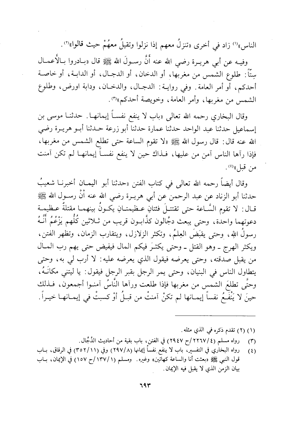 4 رواه البخاري في التفسير، باب لا ينفع نفسا إيمانها "8/ 297" وفي "11/ 352" في الرقاق، باب قول النبي صَلَّى اللَّهُ عَلَيْهِ وَسَلَّمَ: "بعثت أنا والساعة كهاتين" وغيره. ومسلم "1/ 137/ ح157" في الإيمان، باب بيان الزمن الذي لا يقبل فيه الإيمان.