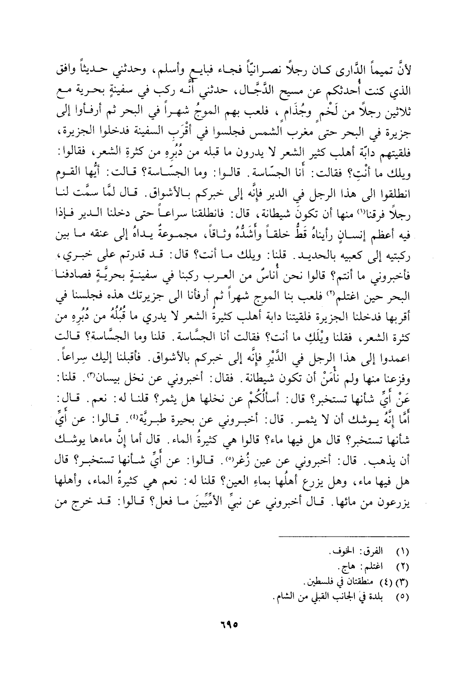 لِأَنَّ تَمِيمًا الدَّارِيَّ كَانَ رَجُلًا نَصْرَانِيًّا فَجَاءَ فَبَايَعَ وَأَسْلَمَ, وَحَدَّثَنِي حَدِيثًا وَافَقَ الَّذِي كُنْتُ أحدثكم عن المسيح الدَّجَّالِ, حَدَّثَنِي أَنَّهُ رَكِبَ فِي سَفِينَةٍ بَحْرِيَّةٍ مَعَ ثَلَاثِينَ رَجُلًا مِنْ لَخْمٍ وَجُذَامٍ فَلَعِبَ بِهِمُ الْمَوْجُ شَهْرًا فِي البحر ثم أرفئوا إِلَى جَزِيرَةٍ فِي الْبَحْرِ حَتَّى مَغْرِبِ الشَّمْسِ فَجَلَسُوا فِي أَقْرَبِ السَّفِينَةِ فَدَخَلُوا الْجَزِيرَةَ, فَلَقِيَتْهُمْ دابة أهلب كثيرة الشَّعَرِ لَا يَدْرُونَ مَا قُبُلُهُ مِنْ دُبُرِهِ مِنْ كَثْرَةِ الشَّعَرِ, فَقَالُوا: وَيْلَكَ مَا أَنْتِ؟ فَقَالَتْ: أَنَا الْجَسَّاسَةُ قَالُوا: وَمَا الْجَسَّاسَةُ؟ قَالَتْ: أَيُّهَا الْقَوْمُ انْطَلِقُوا إِلَى هَذَا الرَّجُلِ فِي الدَّيْرِ فَإِنَّهُ إِلَى خَبَرِكُمْ بِالْأَشْوَاقِ قَالَ: لَمَّا سَمَّتْ لَنَا رَجُلًا فَرِقْنَا1 مِنْهَا أَنْ تَكُونَ شَيْطَانَةً قَالَ: فَانْطَلَقْنَا سِرَاعًا حَتَّى دَخَلْنَا الدَّيْرَ فَإِذَا فِيهِ أَعْظَمُ إِنْسَانٍ رَأَيْنَاهُ قَطُّ خَلْقًا وَأَشَدُّهُ وِثَاقًا مَجْمُوعَةٌ يَدَاهُ إِلَى عُنُقِهِ مَا بَيْنَ رُكْبَتَيْهِ إِلَى كَعْبَيْهِ بِالْحَدِيدِ قُلْنَا: وَيْلَكَ مَا أَنْتَ؟ قَالَ: قَدْ قَدَرْتُمْ عَلَى خَبَرِي فَأَخْبِرُونِي مَا أَنْتُمْ؟ قَالُوا: نَحْنُ أُنَاسٌ مِنَ الْعَرَبِ رَكِبْنَا فِي سَفِينَةٍ بَحْرِيَّةٍ فَصَادَفْنَا الْبَحْرَ حِينَ اغْتَلَمَ2 فَلَعِبَ بِنَا الْمَوْجُ شَهْرًا ثُمَّ أَرْفَأْنَا إِلَى جَزِيرَتِكَ هَذِهِ فَجَلَسْنَا فِي أَقْرَبِهَا فَدَخَلْنَا الْجَزِيرَةَ فَلَقِيَتْنَا دَابَّةٌ أَهْلَبُ كَثِيرَةُ الشَّعْرِ لَا يُدْرَى مَا قُبُلُهُ مِنْ دُبُرِهِ مِنْ كَثْرَةِ الشَّعْرِ فَقُلْنَا: وَيْلَكِ ما أنت؟ فقلت: أَنَا الْجَسَّاسَةُ قُلْنَا: وَمَا الْجَسَّاسَةُ؟ قَالَتِ: اعْمَدُوا إِلَى هَذَا الرَّجُلِ فِي الدَّيْرِ فَإِنَّهُ إِلَى خَبَرِكُمْ بِالْأَشْوَاقِ فَأَقْبَلْنَا إِلَيْكَ سِرَاعًا وَفَزِعْنَا مِنْهَا وَلَمْ نَأْمَنْ أَنْ تَكُونَ شَيْطَانَةً فَقَالَ: أَخْبِرُونِي عَنْ نَخْلِ بَيْسَانَ3. قُلْنَا: عَنْ أَيِّ شَأْنِهَا تَسْتَخْبِرُ؟ قَالَ: أَسْأَلُكُمْ عَنْ نَخْلِهَا هَلْ يُثْمِرُ؟ قُلْنَا لَهُ: نَعَمْ قَالَ: أَمَا إِنَّهُ يُوشِكُ أَنْ لَا يُثْمِرَ قَالَ: أَخْبِرُونِي عَنْ بُحَيْرَةِ طَبَرِيَّةَ4. قَالُوا: عَنْ أَيِّ شَأْنِهَا تَسْتَخْبِرُ؟ قَالَ: هَلْ فِيهَا مَاءٌ؟ قَالُوا: هِيَ كَثِيرَةُ الْمَاءِ قَالَ: أَمَّا إِنَّ مَاءَهَا يُوشِكُ أَنْ يَذْهَبَ قَالَ: أَخْبِرُونِي عَنْ عَيْنِ زُغَرَ5. قَالُوا: عَنْ أَيِّ شَأْنِهَا تَسْتَخْبِرُ؟ قَالَ: هَلْ فِيهَا مَاءٌ وَهَلْ يَزْرَعُ أَهْلُهَا بِمَاءِ الْعَيْنِ؟ قُلْنَا لَهُ: نَعَمْ هِيَ كَثِيرَةُ الْمَاءِ وَأَهْلُهَا يَزْرَعُونَ مِنْ مَائِهَا قَالَ: أَخْبَرُونِي عَنْ نَبِيِّ الْأُمِّيِّينَ مَا فَعَلَ؟ قَالُوا: قَدْ خَرَجَ مِنْ