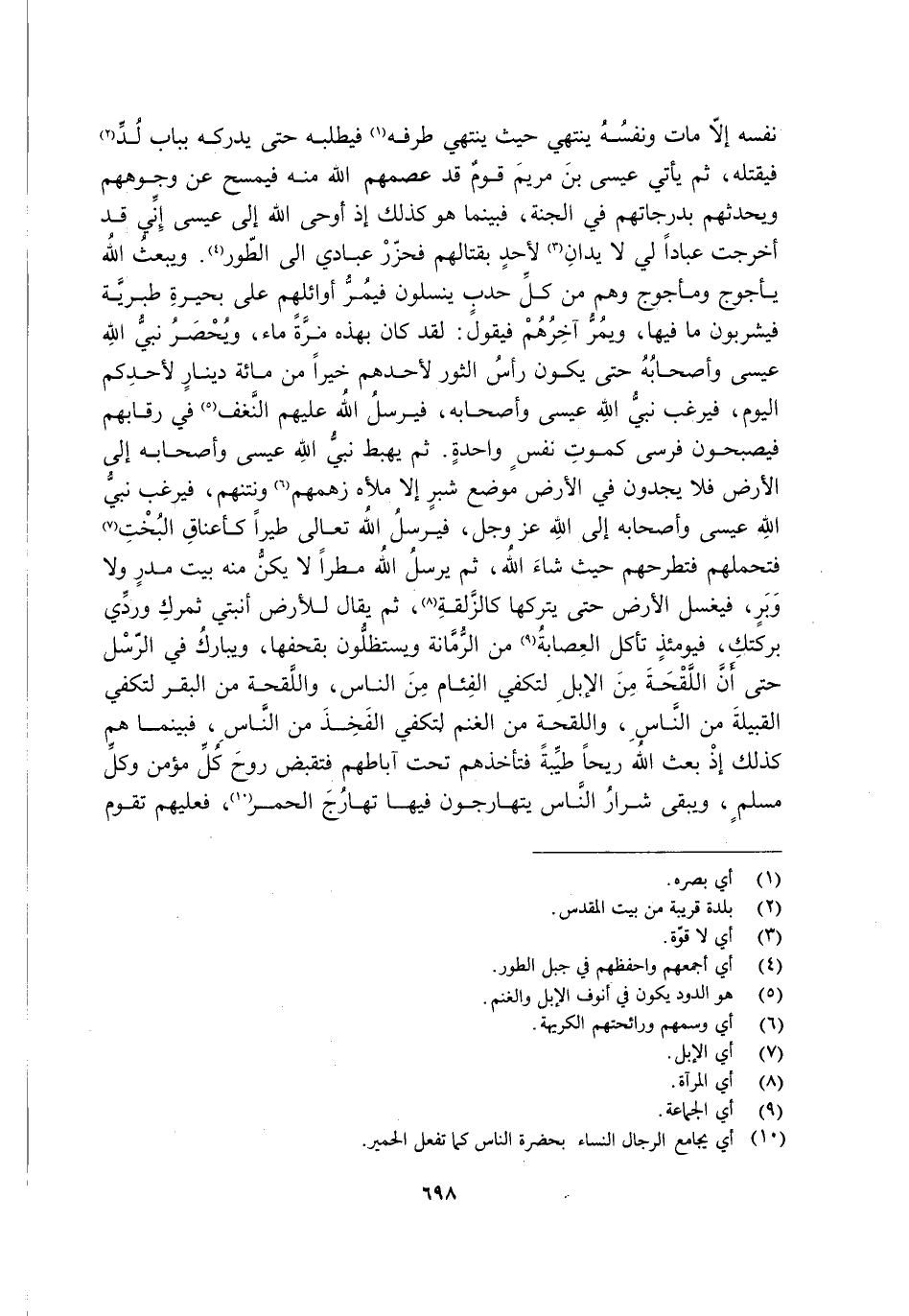 نَفْسِهِ إِلَّا مَاتَ وَنَفْسُهُ يَنْتَهِي حَيْثُ يَنْتَهِي طَرْفُهُ 1 , فَيَطْلُبُهُ حَتَّى يُدْرِكَهُ بِبَابِ لُدٍّ 2 فَيَقْتُلَهُ, ثُمَّ يَأْتِي عِيسَى ابْنَ مَرْيَمَ قَوْمٌ قَدْ عَصَمَهُمُ اللَّهُ مِنْهُ فَيَمْسَحُ عَنْ وُجُوهِهِمْ وَيُحَدِّثُهُمْ بِدَرَجَاتِهِمْ فِي الْجَنَّةِ, فَبَيْنَمَا هُوَ كَذَلِكَ إِذْ أَوْحَى اللَّهُ إِلَى عِيسَى إِنِّي قَدْ أَخْرَجْتُ عِبَادًا لِي لَا يَدَانِ 3 لأحد بقتالهم فحرز عِبَادِي إِلَى الطُّورِ 4. وَيَبْعَثُ اللَّهُ يَأْجُوجَ وَمَأْجُوجَ وَهُمْ مِنْ كُلِّ حَدَبٍ يَنْسِلُونَ فَيَمُرُّ أَوَائِلُهُمْ عَلَى بُحَيْرَةِ طَبَرِيَّةَ فَيَشْرَبُونَ مَا فِيهَا وَيَمُرُّ آخِرُهُمْ فَيَقُولُ: لَقَدْ كَانَ بِهَذِهِ مَرَّةً مَاءٌ وَيُحْصَرُ نَبِيُّ اللَّهِ عِيسَى وَأَصْحَابُهُ حَتَّى يَكُونَ رَأْسُ الثَّوْرِ لِأَحَدِهِمْ خَيْرًا مِنْ مِائَةِ دِينَارٍ لِأَحَدِكُمُ الْيَوْمَ, فَيَرْغَبُ نَبِيُّ اللَّهِ عِيسَى وَأَصْحَابُهُ فَيُرْسِلُ اللَّهُ عَلَيْهِمُ النَّغَفَ 5 فِي رِقَابِهِمْ فَيُصْبِحُونَ فَرْسَى كَمَوْتِ نَفْسٍ وَاحِدَةٍ, ثُمَّ يَهْبِطُ نَبِيُّ اللَّهِ عِيسَى وَأَصْحَابُهُ إِلَى الْأَرْضِ فَلَا يَجِدُونَ فِي الْأَرْضِ مَوْضِعَ شِبْرٍ إِلَّا مَلَأَهُ زَهَمُهُمْ 6 وَنَتْنُهُمْ, فَيَرْغَبُ نَبِيُّ اللَّهِ عِيسَى وَأَصْحَابُهُ إِلَى اللَّهِ عَزَّ وَجَلَّ فَيُرْسِلُ اللَّهُ تَعَالَى طَيْرًا كَأَعْنَاقِ الْبُخْتِ 7 فَتَحْمِلُهُمْ فَتَطْرَحُهُمْ حَيْثُ شَاءَ اللَّهُ ثُمَّ يُرْسِلُ اللَّهُ مَطَرًا لَا يَكُنُّ مِنْهُ بَيْتُ مَدَرٍ وَلَا وَبَرٍ فَيَغْسِلُ الْأَرْضَ حَتَّى يَتْرُكَهَا كَالزَّلَقَةِ 8 ثُمَّ يُقَالُ لِلْأَرْضِ: أَنْبِتِي ثَمَرَكِ وَرُدِّي بَرَكَتَكِ فَيَوْمَئِذٍ تَأْكُلُ الْعِصَابَةُ 9 مِنَ الرُّمَّانَةِ وَيَسْتَظِلُّونَ بِقِحْفِهَا, وَيُبَارِكُ فِي الرِّسْلِ حَتَّى أَنَّ اللِّقْحَةَ مِنَ الْإِبِلِ لَتَكْفِي الْفِئَامَ مِنَ النَّاسِ وَاللِّقْحَةَ مِنَ الْبَقَرِ لَتَكْفِي الْقَبِيلَةَ مِنَ النَّاسِ وَاللِّقْحَةَ مِنَ الْغَنَمِ لَتَكْفِي الْفَخِذَ مِنَ النَّاسِ, فَبَيْنَمَا هُمْ كَذَلِكَ إِذْ بَعَثَ اللَّهُ رِيحًا طَيِّبَةً فَتَأْخُذُهُمْ تَحْتَ إِبَاطِهِمْ فَتَقْبِضُ رُوحَ كُلِّ مُؤْمِنٍ وَكُلِّ مُسْلِمٍ, وَيَبْقَى شِرَارُ النَّاسِ يَتَهَارَجُونَ فِيهَا تَهَارُجَ الْحُمُرِ 10 فَعَلَيْهِمْ تَقُومُ
