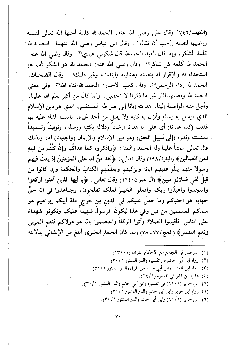[الْكَهْفِ: 64] 1 وَقَالَ عَلِيٌّ رَضِيَ اللَّهُ عَنْهُ: الْحَمْدُ لِلَّهِ كَلِمَةٌ أَحَبَّهَا اللَّهُ تَعَالَى لِنَفْسِهِ وَرَضِيَهَا لِنَفْسِهِ وَأَحَبَّ أَنْ تُقَالَ2. وَقَالَ ابْنُ عَبَّاسٍ رَضِيَ اللَّهُ عَنْهُمَا: الْحَمْدُ لِلَّهِ كَلِمَةُ الشُّكْرِ وَإِذَا قَالَ الْعَبْدُ الْحَمْدُ لِلَّهِ قَالَ شَكَرَنِي عَبْدِي 3. وَقَالَ رَضِيَ اللَّهُ عَنْهُ: الْحَمْدُ لِلَّهِ كَلِمَةُ كُلِّ شَاكِرٍ4. وَقَالَ رَضِيَ اللَّهُ عَنْهُ: الْحَمْدُ لِلَّهِ هُوَ الشُّكْرُ لِلَّهِ هُوَ اسْتِخْذَاءٌ لَهُ وَالْإِقْرَارُ لَهُ بِنِعْمَتِهِ وَهِدَايَتِهِ وَابْتِدَائِهِ وَغَيْرِ ذَلِكَ5. وَقَالَ الضَّحَّاكُ: الْحَمْدُ لِلَّهِ رِدَاءُ الرَّحْمَنِ6، وَقَالَ كَعْبُ الْأَحْبَارِ: الْحَمْدُ لِلَّهِ ثَنَاءُ اللَّهِ7. وَفِي مَعْنَى الْحَمْدُ لِلَّهِ وَفَضْلِهَا آثَارٌ غَيْرُ مَا ذَكَرْنَا لَا تُحْصَى. وَلَمَّا كَانَ مِنْ أَكْبَرِ نِعَمِ اللَّهِ عَلَيْنَا وَأَجَلِّ مِنَنِهِ الْوَاصِلَةِ إِلَيْنَا هِدَايَتُهُ إِيَّانَا إِلَى صِرَاطِهِ الْمُسْتَقِيمِ, الَّذِي هُوَ دِينُ الْإِسْلَامِ الَّذِي أَرْسَلَ بِهِ رُسُلَهُ وَأَنْزَلَ بِهِ كُتُبَهُ وَلَا يَقْبَلُ مِنْ أَحَدٍ غَيْرَهُ نَاسَبَ الثَّنَاءُ عَلَيْهِ بِهَا فَقُلْتُ "كَمَا هَدَانَا" أَيْ: عَلَى مَا هَدَانَا إِرْشَادًا وَدَلَالَةً بِكُتُبِهِ وَرُسُلِهِ, وَتَوْفِيقًا وَتَسْدِيدًا بِمَشِيئَتِهِ وَقَدَرِهِ "إِلَى سَبِيلِ الْحَقِّ" وَهُوَ دِينُ الْإِسْلَامِ وَالْإِيمَانِ "وَاجْتَبَانَا" لَهُ, وَبِذَلِكَ قَالَ تَعَالَى مُمْتَنًّا عَلَيْنَا وَلَهُ الْحَمْدُ وَالْمِنَّةُ: {وَاذْكُرُوهُ كَمَا هَدَاكُمْ وَإِنْ كُنْتُمْ مِنْ قَبْلِهِ لَمِنَ الضَّالِّينَ} [الْبَقَرَةِ: 198] وَقَالَ تَعَالَى: {لَقَدْ مَنَّ اللَّهُ عَلَى الْمُؤْمِنِينَ إِذْ بَعَثَ فِيهِمْ رَسُولًا مِنْ أَنْفُسِهِمْ يَتْلُو عَلَيْهِمْ آيَاتِهِ وَيُزَكِّيهِمْ وَيُعَلِّمُهُمُ الْكِتَابَ وَالْحِكْمَةَ وَإِنْ كَانُوا مِنْ قَبْلُ لَفِي ضَلَالٍ مُبِينٍ} [آلِ عِمْرَانَ: 164] وَقَالَ تَعَالَى: {يَا أَيُّهَا الَّذِينَ آمَنُوا ارْكَعُوا وَاسْجُدُوا وَاعْبُدُوا رَبَّكُمْ وَافْعَلُوا الْخَيْرَ لَعَلَّكُمْ تُفْلِحُونَ، وَجَاهِدُوا فِي اللَّهِ حَقَّ جِهَادِهِ هُوَ اجْتَبَاكُمْ وَمَا جَعَلَ عَلَيْكُمْ فِي الدِّينِ مِنْ حَرَجٍ مِلَّةَ أَبِيكُمْ إِبْرَاهِيمَ هُوَ سَمَّاكُمُ الْمُسْلِمِينَ مِنْ قَبْلُ وَفِي هَذَا لِيَكُونَ الرَّسُولُ شَهِيدًا عَلَيْكُمْ وَتَكُونُوا شُهَدَاءَ عَلَى النَّاسِ فَأَقِيمُوا الصَّلَاةَ وَآتُوا الزَّكَاةَ وَاعْتَصِمُوا بِاللَّهِ هُوَ مَوْلَاكُمْ فَنِعْمَ الْمَوْلَى وَنِعْمَ النَّصِيرُ} [الْحَجِّ: 77-78] وَلَمَّا كَانَ الْحَمْدُ الْخَبَرِيُّ أَبْلَغَ مِنَ الْإِنْشَائِيِّ لِدَلَالَتِهِ