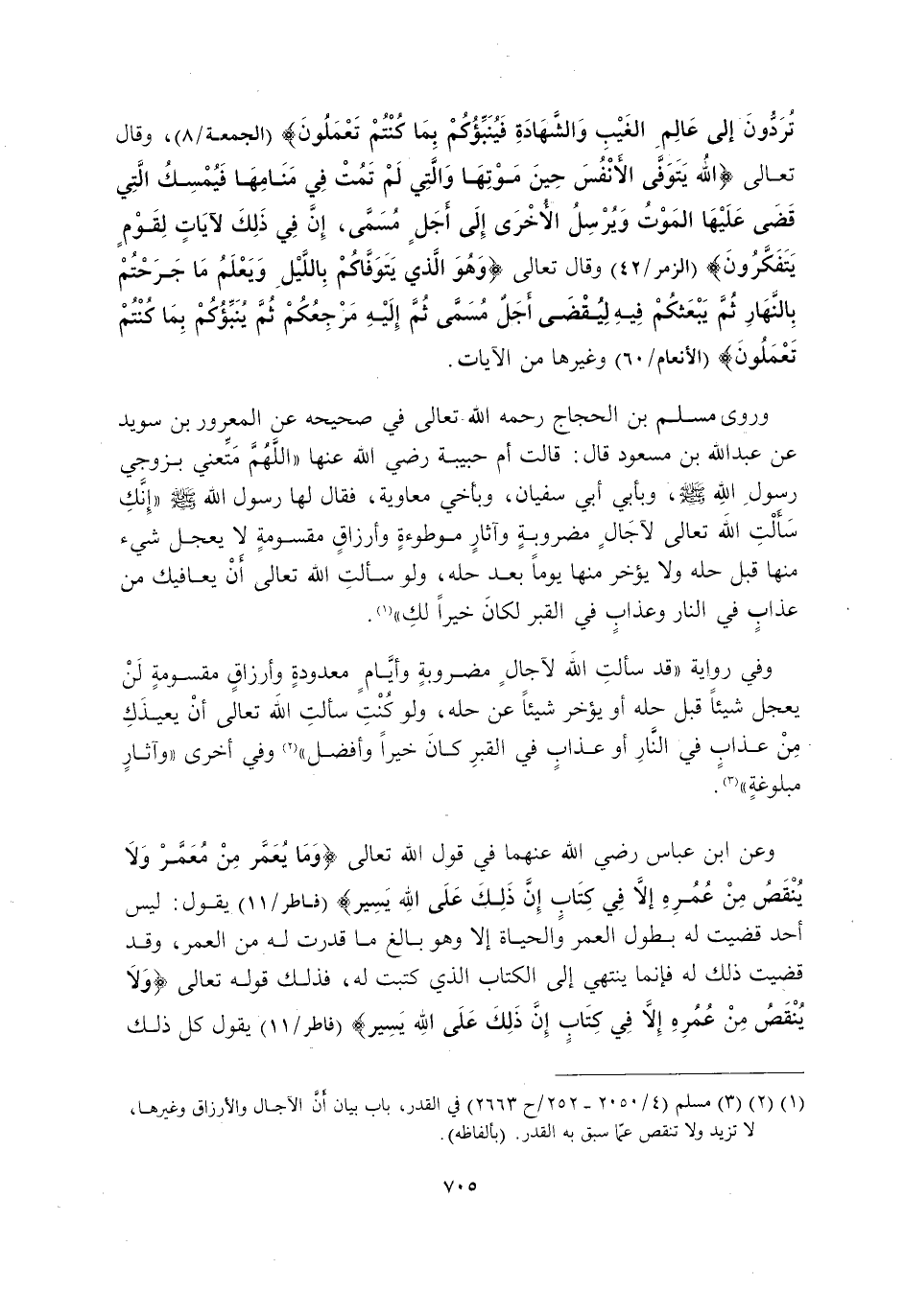 وَرَوَى مُسْلِمُ بْنُ الْحَجَّاجِ رَحِمَهُ اللَّهُ تَعَالَى فِي صَحِيحِهِ عَنِ الْمَعْرُورِ بْنِ سُوَيْدٍ عَنْ عَبْدِ اللَّهِ بْنِ مَسْعُودٍ قَالَ: قَالَتْ أُمُّ حَبِيبَةَ رَضِيَ اللَّهُ عَنْهَا: اللَّهُمَّ مَتِّعْنِي بِزَوْجِي رَسُولِ اللَّهِ صَلَّى اللَّهُ عَلَيْهِ وَسَلَّمَ وَبِأَبِي أَبِي سُفْيَانَ وَبِأَخِي مُعَاوِيَةَ, فَقَالَ لَهَا رَسُولُ اللَّهِ صَلَّى اللَّهُ عَلَيْهِ وَسَلَّمَ: " إِنَّكِ سَأَلْتِ اللَّهَ تَعَالَى لِآجَالٍ مَضْرُوبَةٍ وَآثَارٍ مَوْطُوءَةٍ وَأَرْزَاقٍ مَقْسُومَةٍ لَا يُعَجَّلُ شَيْءٌ مِنْهَا قَبْلَ حِلِّهِ وَلَا يُؤَخِّرُ مِنْهَا يَوْمًا بَعْدَ حِلِّهِ, وَلَوْ سَأَلْتِ اللَّهَ تَعَالَى أَنْ يُعَافِيَكِ مِنْ عَذَابٍ فِي النَّارِ وَعَذَابٍ فِي الْقَبْرِ لَكَانَ خَيْرًا لَكِ" 1.