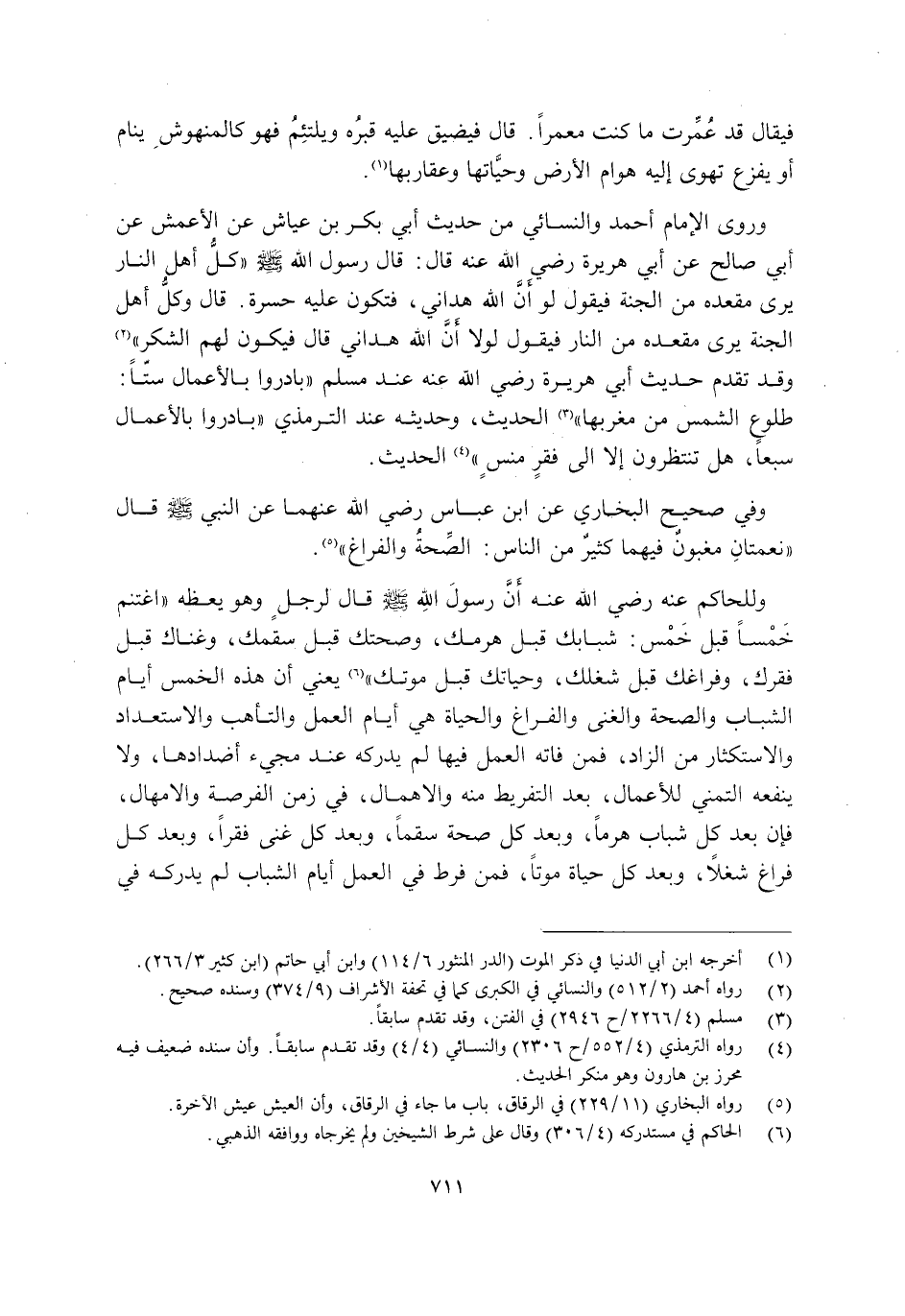 وَلِلْحَاكِمِ عَنْهُ رَضِيَ اللَّهُ عَنْهُ أَنَّ رَسُولَ اللَّهِ -صَلَّى اللَّهُ عَلَيْهِ وَسَلَّمَ- قَالَ لِرَجُلٍ وَهُوَ يَعِظُهُ: "اغْتَنِمْ خَمْسًا قَبْلَ خَمْسٍ: شَبَابَكَ قَبْلَ هَرَمِكَ, وَصِحَّتَكَ قَبْلَ سَقَمِكَ, وَغِنَاكَ قَبْلَ فَقْرِكَ, وَفَرَاغَكَ قَبْلَ شُغْلِكَ, وَحَيَاتَكَ قَبْلَ مَوْتِكَ" 6. يَعْنِي أَنَّ هَذِهِ الْخَمْسَ: أَيَّامَ الشَّبَابِ وَالصِّحَّةِ وَالْغِنَى وَالْفَرَاغِ وَالْحَيَاةِ هِيَ أَيَّامُ الْعَمَلِ وَالتَّأَهُّبِ وَالِاسْتِعْدَادِ وَالِاسْتِكْثَارِ مِنَ الزَّادِ, فَمَنْ فَاتَهُ الْعَمَلُ فِيهَا لَمْ يُدْرِكْهُ عِنْدَ مَجِيءِ أَضْدَادِهَا, وَلَا يَنْفَعْهُ التَّمَنِّي لِلْأَعْمَالِ بَعْدَ التَّفْرِيطِ مِنْهُ وَالْإِهْمَالِ فِي زَمَنِ الْفُرْصَةِ وَالْإِمْهَالِ فَإِنَّ بَعْدَ كُلِّ شَبَابٍ هَرَمًا وَبَعْدَ كُلِّ صِحَّةٍ سَقَمًا وَبَعْدَ كُلِّ غِنًى فَقْرًا وَبَعْدَ كُلِّ فَرَاغٍ شُغْلًا وَبَعْدَ كُلِّ حَيَاةٍ مَوْتًا, فَمَنْ فَرَّطَ فِي الْعَمَلِ أَيَّامَ الشَّبَابِ لَمْ يُدْرِكْهُ فِي