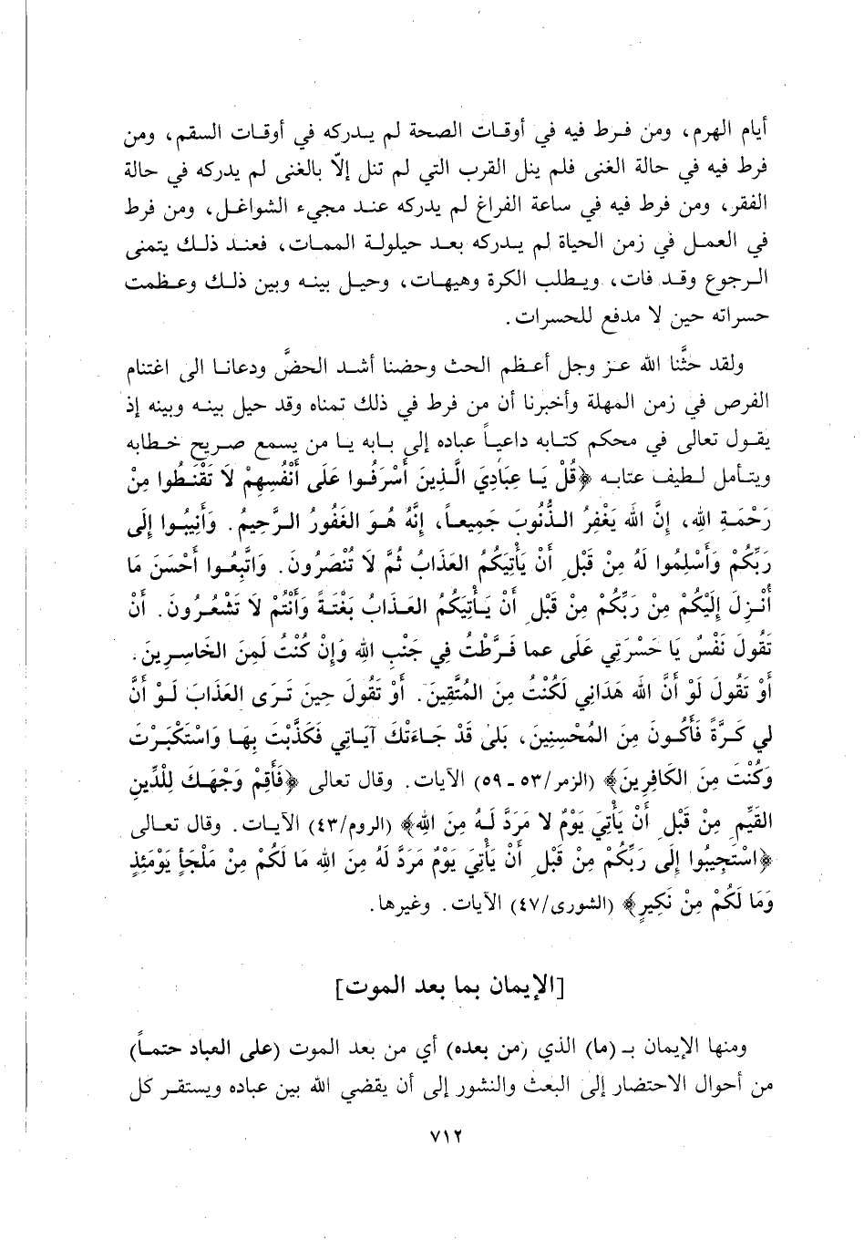 وَلَقَدْ حَثَّنَا اللَّهُ -عَزَّ وَجَلَّ- أَعْظَمَ الْحَثِّ وَحَضَّنَا أَشَدَّ الْحَضِّ وَدَعَانَا إِلَى اغْتِنَامِ الْفُرَصِ فِي زَمَنِ الْمُهْلَةِ وَأَخْبَرَنَا أَنَّ مَنْ فَرَّطَ فِي ذَلِكَ تَمَنَّاهُ وَقَدْ حِيلَ بَيْنَهُ وَبَيْنَهُ إِذْ يَقُولُ تَعَالَى فِي مُحْكَمِ كِتَابِهِ دَاعِيًا عِبَادَهُ إِلَى بَابِهِ, يَا مَنْ يُسْمَعُ صَرِيحُ خِطَابِهِ وَيُتَأَمَّلُ لَطِيفُ عِتَابِهِ: {قُلْ يَا عِبَادِيَ الَّذِينَ أَسْرَفُوا عَلَى أَنْفُسِهِمْ لَا تَقْنَطُوا مِنْ رَحْمَةِ اللَّهِ إِنَّ اللَّهَ يَغْفِرُ الذُّنُوبَ جَمِيعًا إِنَّهُ هُوَ الْغَفُورُ الرَّحِيمُ وَأَنِيبُوا إِلَى رَبِّكُمْ وَأَسْلِمُوا لَهُ مِنْ قَبْلِ أَنْ يَأْتِيَكُمُ الْعَذَابُ ثُمَّ لَا تُنْصَرُونَ وَاتَّبِعُوا أَحْسَنَ مَا أُنْزِلَ إِلَيْكُمْ مِنْ رَبِّكُمْ مِنْ قَبْلِ أَنْ يَأْتِيَكُمُ الْعَذَابُ بَغْتَةً وَأَنْتُمْ لَا تَشْعُرُونَ أَنْ تَقُولَ نَفْسٌ يَا حَسْرَتَى عَلَى مَا فَرَّطْتُ فِي جَنْبِ اللَّهِ وَإِنْ كُنْتُ لَمِنَ السَّاخِرِينَ أَوْ تَقُولَ لَوْ أَنَّ اللَّهَ هَدَانِي لَكُنْتُ مِنَ الْمُتَّقِينَ أَوْ تَقُولَ حِينَ تَرَى الْعَذَابَ لَوْ أَنَّ لِي كَرَّةً فَأَكُونَ مِنَ الْمُحْسِنِينَ بَلَى قَدْ جَاءَتْكَ آيَاتِي فَكَذَّبْتَ بِهَا وَاسْتَكْبَرْتَ وَكُنْتَ مِنَ الْكَافِرِينَ} [الزُّمَرِ: 53-59] الْآيَاتِ, وَقَالَ تَعَالَى: {فَأَقِمْ وَجْهَكَ لِلدِّينِ الْقَيِّمِ مِنْ قَبْلِ أَنْ يَأْتِيَ يَوْمٌ لَا مَرَدَّ لَهُ مِنَ اللَّهِ} [الرُّومِ: 43] الْآيَاتِ, وَقَالَ تَعَالَى: {اسْتَجِيبُوا لِرَبِّكُمْ مِنْ قَبْلِ أَنْ يَأْتِيَ يَوْمٌ لَا مَرَدَّ لَهُ مِنَ اللَّهِ مَا لَكُمْ مِنْ مَلْجَإٍ يَوْمَئِذٍ وَمَا لَكُمْ مِنْ نَكِيرٍ} [الشُّورَى: 47] الْآيَاتِ, وَغَيْرُهَا.