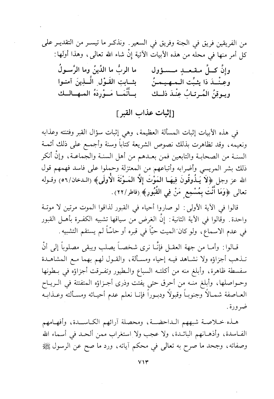 فِي هَذِهِ الْأَبْيَاتِ إِثْبَاتُ الْمَسْأَلَةِ الْعَظِيمَةِ, وَهِيَ إِثْبَاتُ سُؤَالِ الْقَبْرِ وَفِتْنَتِهِ وَعَذَابِهِ وَنَعِيمِهِ, وَقَدْ تَظَاهَرَتْ بِذَلِكَ نُصُوصُ الشَّرِيعَةِ كِتَابًا وَسُنَّةً وَأَجْمَعَ عَلَى ذَلِكَ أَئِمَّةُ السُّنَّةِ مِنَ الصَّحَابَةِ وَالتَّابِعِينَ فَمَنْ بَعْدَهُمْ مِنْ أَهْلِ السُّنَّةِ وَالْجَمَاعَةِ, وَإِنْ أَنْكَرَ ذَلِكَ بِشْرٌ الْمَرِيسِيُّ وَأَضْرَابُهُ وَأَتْبَاعُهُمْ مِنَ الْمُعْتَزِلَةِ وَحَمَلُوا عَلَى فَاسِدِ فَهْمِهِمْ قَوْلَ اللَّهِ عَزَّ وَجَلَّ: {لَا يَذُوقُونَ فِيهَا الْمَوْتَ إِلَّا الْمَوْتَةَ الْأُولَى} [الدُّخَانِ: 56] وَقَوْلُهُ تَعَالَى: {وَمَا أَنْتَ بِمُسْمِعٍ مَنْ فِي الْقُبُورِ} [فَاطِرٍ: 22] .