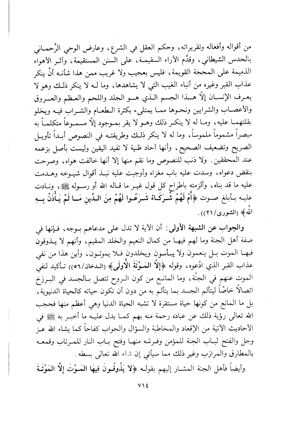 وَالْجَوَابُ عَنِ الشُّبْهَةِ الْأُولَى: أَنَّ الْآيَةَ لَا تَدُلُّ عَلَى مُدَّعَاهُمْ بِوَجْهٍ, فَإِنَّهَا فِي صِفَةِ أَهْلِ الْجَنَّةِ وَمَا لَهُمْ فِيهَا مِنْ كَمَالِ النَّعِيمِ وَالْخُلْدِ الْمُقِيمِ, وَأَنَّهُمْ لَا يَذُوقُونَ فِيهَا الْمَوْتَ بَلْ يَنْعَمُونَ وَلَا يَبْأَسُونَ وَيُخَلَّدُونَ فَلَا يَمُوتُونَ, وَأَيْنَ هَذَا مِنْ نَفْيِ عَذَابِ الْقَبْرِ الَّذِي ادَّعَوْهُ, وَقَوْلُهُ: {إِلَّا الْمَوْتَةَ الْأُولَى} [الدُّخَانِ: 56] تَأْكِيدٌ لِنَفْيِ الْمَوْتِ عَنْهُمْ فِي الْجَنَّةِ, وَمَا الْمَانِعُ مِنْ كَوْنِ الرُّوحِ تَتَّصِلُ بِالْجَسَدِ فِي الْبَرْزَخِ اتِّصَالًا خَاصًّا لِيَتَأَلَّمَ الْجَسَدُ بِمَا يَتَأَلَّمُ بِهِ مِنْ دُونِ أَنْ تَكُونَ حَيَاتُهُ كَالْحَيَاةِ الدُّنْيَوِيَّةِ, بَلْ مَا الْمَانِعُ مِنْ كَوْنِهَا حَيَاةً مُسْتَقِرَّةً لَا تُشْبِهُ الْحَيَاةَ الدُّنْيَا وَهِيَ أَعْظَمُ مِنْهَا فَحَجَبَ اللَّهُ تَعَالَى رُؤْيَةَ ذَلِكَ عَنْ عِبَادِهِ رَحْمَةً مِنْهُ بِهِمْ كَمَا يَدُلُّ عَلَيْهِ مَا أَخْبَرَ بِهِ صَلَّى اللَّهُ عَلَيْهِ وَسَلَّمَ فِي الْأَحَادِيثِ الْآتِيَةِ مِنَ الْإِقْعَادِ وَالْمُخَاطَبَةِ وَالسُّؤَالِ وَالْجَوَابِ كِفَاحًا كَمَا يَشَاءُ اللَّهُ عَزَّ وَجَلَّ وَالْفَتْحِ لِبَابِ الْجَنَّةِ لِلْمُؤْمِنِ وَفُرُشِهِ مِنْهَا, وَفَتْحِ بَابِ النَّارِ لِلْمُرْتَابِ وَقَمْعِهِ بِالْمَطَارِقِ وَالْمَرَازِبِ وَغَيْرِ ذَلِكَ مِمَّا سَيَأْتِي إِنْ شَاءَ اللَّهُ تَعَالَى بَسْطُهُ.