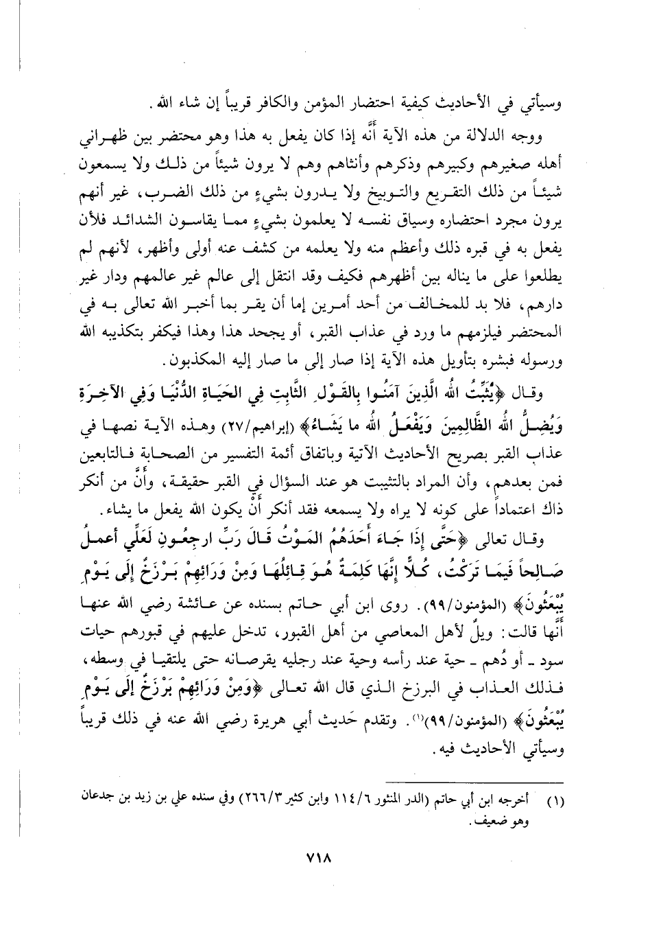 وَقَالَ: {يُثَبِّتُ اللَّهُ الَّذِينَ آمَنُوا بِالْقَوْلِ الثَّابِتِ فِي الْحَيَاةِ الدُّنْيَا وَفِي الْآخِرَةِ وَيُضِلُّ اللَّهُ الظَّالِمِينَ وَيَفْعَلُ اللَّهُ مَا يَشَاءُ} [إِبْرَاهِيمَ: 27] وَهَذِهِ الْآيَةُ نَصُّهَا فِي عَذَابِ الْقَبْرِ بِصَرِيحِ الْأَحَادِيثِ الْآتِيَةِ وَبِاتِّفَاقِ أَئِمَّةِ التَّفْسِيرِ مِنَ الصَّحَابَةِ فَالتَّابِعِينَ فَمَنْ بَعْدَهُمْ, وَإِنَّ الْمُرَادَ بِالتَّثْبِيتِ هُوَ عِنْدَ السُّؤَالِ فِي الْقَبْرِ حَقِيقَةً, وَأَنَّ مَنْ أَنْكَرَ ذَاكَ اعْتِمَادًا عَلَى كَوْنِهِ لَا يَرَاهُ وَلَا يَسْمَعُهُ فَقَدْ أَنْكَرَ أَنْ يَكُونَ اللَّهُ يَفْعَلُ مَا يَشَاءُ.