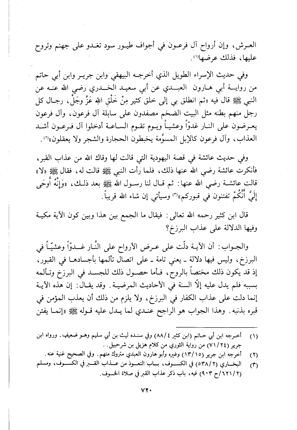 وَالْجَوَابُ: أَنَّ الْآيَةَ دَلَّتْ عَلَى عَرْضِ الْأَرْوَاحِ عَلَى النَّارِ غُدُوًّا وَعَشِيًّا فِي الْبَرْزَخِ, وَلَيْسَ فِيهَا دَلَالَةٌ -يَعْنِي تَامَّةً- عَلَى اتِّصَالِ تَأَلُّمِهَا بِأَجْسَادِهَا فِي الْقُبُورِ, إِذْ قَدْ يَكُونُ ذَلِكَ مُخْتَصًّا بِالرُّوحِ, فَأَمَّا حُصُولُ ذَلِكَ لِلْجَسَدِ فِي الْبَرْزَخِ وَتَأَلُّمُهُ بِسَبَبِهِ فَلَمْ يَدُلَّ عَلَيْهِ إِلَّا السُّنَّةُ فِي الْأَحَادِيثِ الْمَرْضِيَّةِ. وَقَدْ يُقَالُ: إِنَّ هَذِهِ الْآيَةَ إِنَّمَا دَلَّتْ عَلَى عَذَابِ الْكُفَّارِ فِي الْبَرْزَخِ, وَلَا يَلْزَمُ مِنْ ذَلِكَ أَنْ يُعَذِّبَ الْمُؤْمِنُ فِي قَبْرِهِ بِذَنْبِهِ. وَهَذَا الْجَوَابُ هُوَ الرَّاجِحُ عِنْدِي لِمَا يَدُلُّ عَلَيْهِ قَوْلُهُ صَلَّى اللَّهُ عَلَيْهِ وَسَلَّمَ: "إِنَّمَا يُفْتَنُ