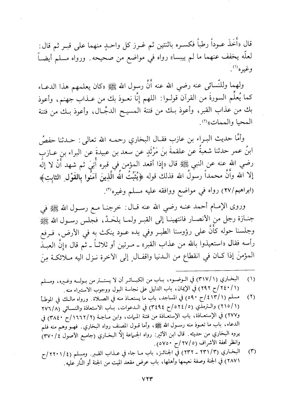 وَأَمَّا حَدِيثُ الْبَرَاءِ بْنِ عَازِبٍ فَقَالَ الْبُخَارِيُّ رَحِمَهُ اللَّهُ تَعَالَى: حَدَّثَنَا حَفْصُ بْنُ عُمَرَ حَدَّثَنَا شُعْبَةُ عَنْ عَلْقَمَةَ بْنِ مرثد عن سعيد بْنِ عُبَيْدَةَ عَنِ الْبَرَاءِ بْنِ عَازِبٍ رَضِيَ اللَّهُ عَنْهُ عَنِ النَّبِيِّ صَلَّى اللَّهُ عَلَيْهِ وَسَلَّمَ قَالَ: "إِذَا أُقْعِدَ الْمُؤْمِنُ فِي قَبْرِهِ أُتِيَ ثُمَّ شَهِدَ أَنْ لَا إِلَهَ إِلَّا اللَّهُ وَأَنَّ مُحَمَّدًا رَسُولُ اللَّهِ, فَذَلِكَ قَوْلُهُ: {يُثَبِّتُ اللَّهُ الَّذِينَ آمَنُوا بِالْقَوْلِ الثَّابِتِ} [إِبْرَاهِيمَ: 27] "، رَوَاهُ فِي مَوَاضِعَ وَوَافَقَهُ عَلَيْهِ مُسْلِمٌ وَغَيْرُهُ3.