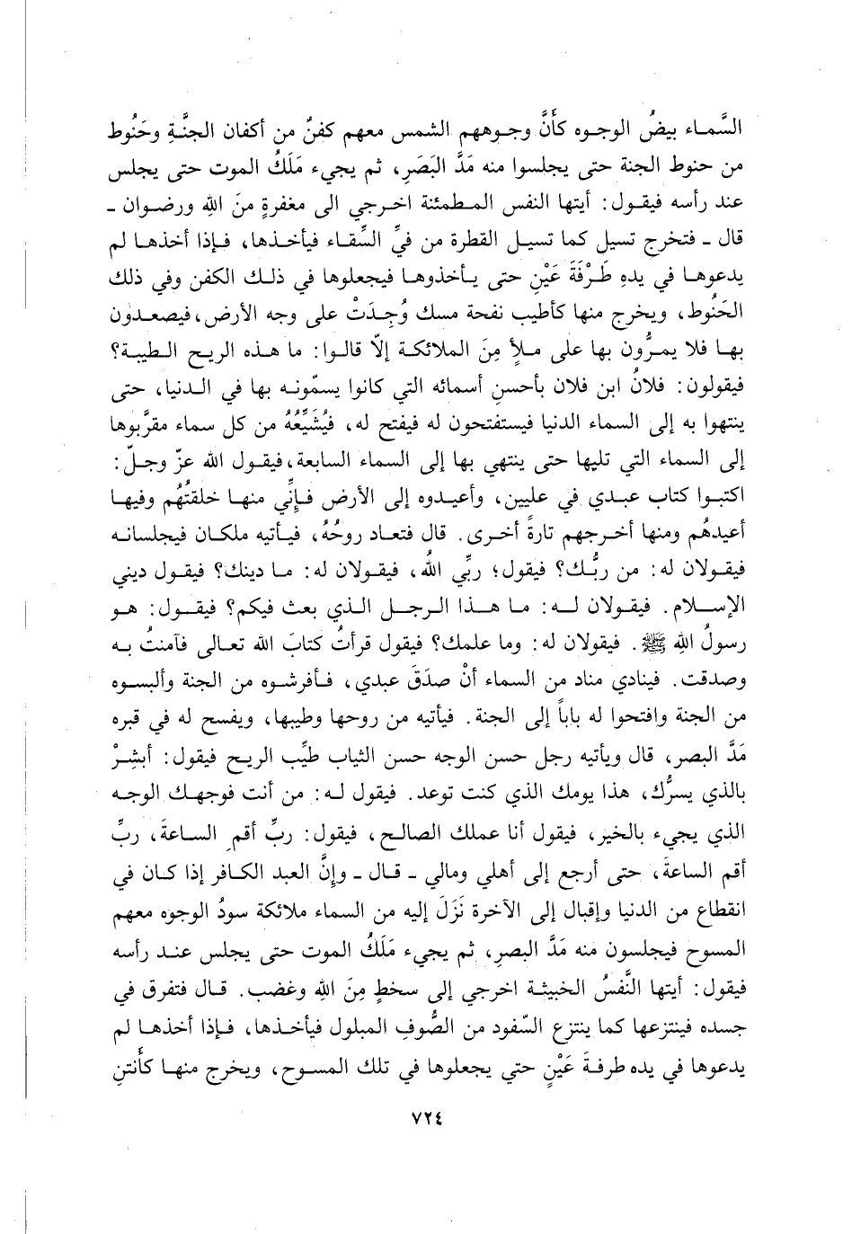 السَّمَاءِ بِيضُ الْوُجُوهِ كَأَنَّ وُجُوهَهُمُ الشَّمْسُ, مَعَهُمْ كَفَنٌ مِنْ أَكْفَانِ الْجَنَّةِ وَحَنُوطٌ مِنْ حَنُوطِ الْجَنَّةِ, حَتَّى يَجْلِسُوا مِنْهُ مَدَّ الْبَصَرِ, ثُمَّ يَجِيءُ مَلَكُ الْمَوْتِ حَتَّى يَجْلِسَ عِنْدَ رَأْسِهِ فَيَقُولَ: أيتها النفس المطمئنة اخْرُجِي إِلَى مَغْفِرَةٍ مِنَ الله ورضوان -قال- فَتَخْرُجُ تَسِيلُ كَمَا تَسِيلُ الْقَطْرَةُ مِنْ فِي السِّقَاءِ فَيَأْخُذُهَا, فَإِذَا أَخَذَهَا لَمْ يَدَعُوهَا فِي يَدِهِ طَرْفَةَ عَيْنٍ حَتَّى يَأْخُذُوهَا فَيَجْعَلُوهَا فِي ذَلِكَ الْكَفَنِ وَفِي ذَلِكَ الْحَنُوطِ, وَيَخْرُجُ مِنْهَا كَأَطْيَبِ نَفْحَةِ مِسْكٍ وُجِدَتْ عَلَى وَجْهِ الْأَرْضِ, فَيَصْعَدُونَ بِهَا فَلَا يَمُرُّونَ بِهَا عَلَى مَلَإٍ مِنَ الْمَلَائِكَةِ إِلَّا قَالُوا: مَا هذه الريح الطيبة؟ فَيَقُولُونَ: فُلَانُ ابن فُلَانٍ بِأَحْسَنِ أَسْمَائِهِ الَّتِي كَانُوا يُسَمُّونَهُ بِهَا فِي الدُّنْيَا, حتى ينتهوا به إِلَى السَّمَاءِ الدُّنْيَا فَيَسْتَفْتِحُونَ له فيفتح لَهُ, فَيُشَيِّعُهُ مِنْ كُلِّ سَمَاءٍ مُقَرِّبُوهَا إِلَى السَّمَاءِ الَّتِي تَلِيهَا حتى ينتهى بها إِلَى السَّمَاءِ السَّابِعَةِ, فَيَقُولُ اللَّهُ عَزَّ وَجَلَّ: اكْتُبُوا كِتَابَ عَبْدِي فِي عِلِّيِّينَ وَأَعِيدُوهُ إِلَى الْأَرْضِ, فَإِنِّي مِنْهَا خَلَقْتُهُمْ وَفِيهَا أُعِيدُهُمْ وَمِنْهَا أُخْرِجُهُمْ تَارَةً أُخْرَى قَالَ: فَتُعَادُ رُوحُهُ فَيَأْتِيهِ مَلَكَانِ فَيُجْلِسَانِهِ فَيَقُولَانِ لَهُ: مَنْ رَبُّكَ؟ فَيَقُولُ: رَبِّيَ اللَّهُ فَيَقُولَانِ لَهُ: مَا دِينُكَ؟ فَيَقُولُ: دِينِيَ الْإِسْلَامُ فَيَقُولَانِ لَهُ: مَا هَذَا الرَّجُلُ الَّذِي بُعِثَ فِيكُمْ؟ فَيَقُولُ: هُوَ رَسُولُ اللَّهِ -صَلَّى اللَّهُ عَلَيْهِ وَسَلَّمَ- فَيَقُولَانِ لَهُ: وَمَا عِلْمُكَ؟ فَيَقُولُ: قَرَأْتُ كتاب الله تعالى فَآمَنْتُ بِهِ وَصَدَّقْتُ. فينادي منادٍ من السَّمَاءِ أَنْ صَدَقَ عَبْدِي فَأَفْرِشُوهُ مِنَ الْجَنَّةِ وَأَلْبِسُوهُ مِنَ الْجَنَّةِ وَافْتَحُوا لَهُ بَابًا إِلَى الْجَنَّةِ, فَيَأْتِيهِ مِنْ رَوْحِهَا وَطِيبِهَا وَيُفْسَحُ لَهُ فِي قبره مد البصر قَالَ: وَيَأْتِيهِ رَجُلٌ حَسَنُ الْوَجْهِ حَسَنُ الثِّيَابِ طَيِّبُ الرِّيحِ فَيَقُولُ: أَبْشِرْ بِالَّذِي يَسُرُّكَ هَذَا يَوْمُكَ الَّذِي كُنْتَ تُوعَدُ, فَيَقُولُ لَهُ: مَنْ أَنْتَ, فوجهك الوجه الذي يَجِيءُ بِالْخَيْرِ؟! فَيَقُولُ: أَنَا عَمَلُكَ الصَّالِحُ فَيَقُولُ: رَبِّ أقم الساعة رب أَقِمِ السَّاعَةَ حَتَّى أَرْجِعَ إِلَى أَهْلِي وَمَالِي -قَالَ- وَإِنَّ الْعَبْدَ الْكَافِرَ إِذَا كَانَ فِي انْقِطَاعٍ مِنَ الدنيا وإقبال إلى الْآخِرَةِ نَزَلَ إِلَيْهِ مِنَ السَّمَاءِ مَلَائِكَةٌ سُودُ الْوُجُوهِ مَعَهُمُ الْمُسُوحُ فَيَجْلِسُونَ مِنْهُ مَدَّ الْبَصَرِ, ثُمَّ يَجِيءُ مَلَكُ الْمَوْتِ حَتَّى يَجْلِسَ عِنْدَ رَأْسِهِ فَيَقُولَ: أَيَّتُهَا النَّفْسُ الْخَبِيثَةُ اخْرُجِي إِلَى سَخَطٍ مِنَ اللَّهِ وَغَضَبٍ قَالَ: فَتُفَرَّقُ فِي جَسَدِهِ فَيَنْتَزِعُهَا كَمَا يُنْتَزَعُ السَّفُّودُ مِنَ الصُّوفِ الْمَبْلُولِ فَيَأْخُذُهَا, فَإِذَا أَخَذَهَا لَمْ يَدَعُوهَا فِي يَدِهِ طَرْفَةَ عَيْنٍ حَتَّى يَجْعَلُوهَا فِي تِلْكَ الْمُسُوحِ, وَيَخْرُجُ مِنْهَا كَأَنْتَنِ